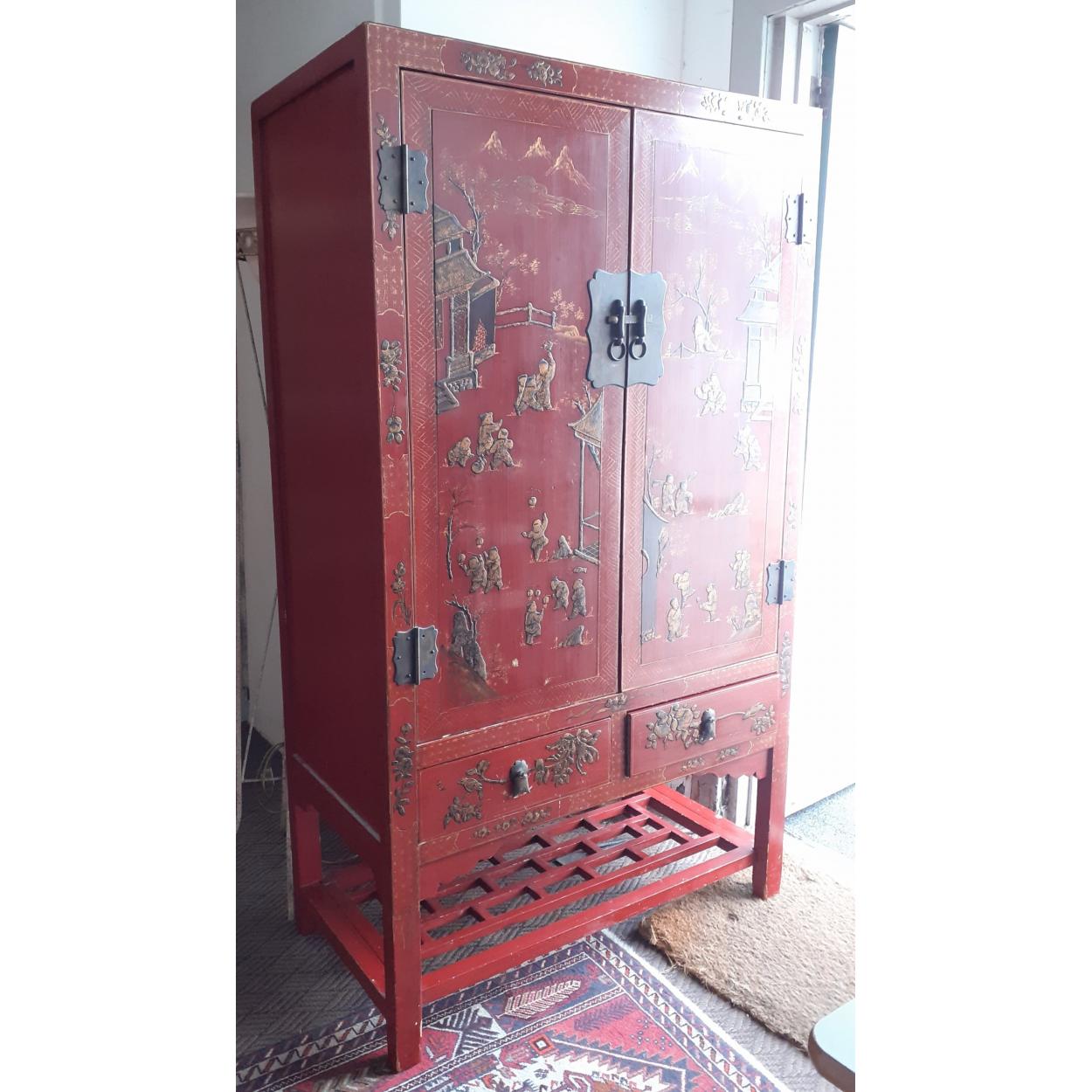 Antique style red and black lacquered Oriental tall cabinet with two doors and a large storage drawer beneath - dimensions 112cm wide x 56cm depth x 193cm tall approx
