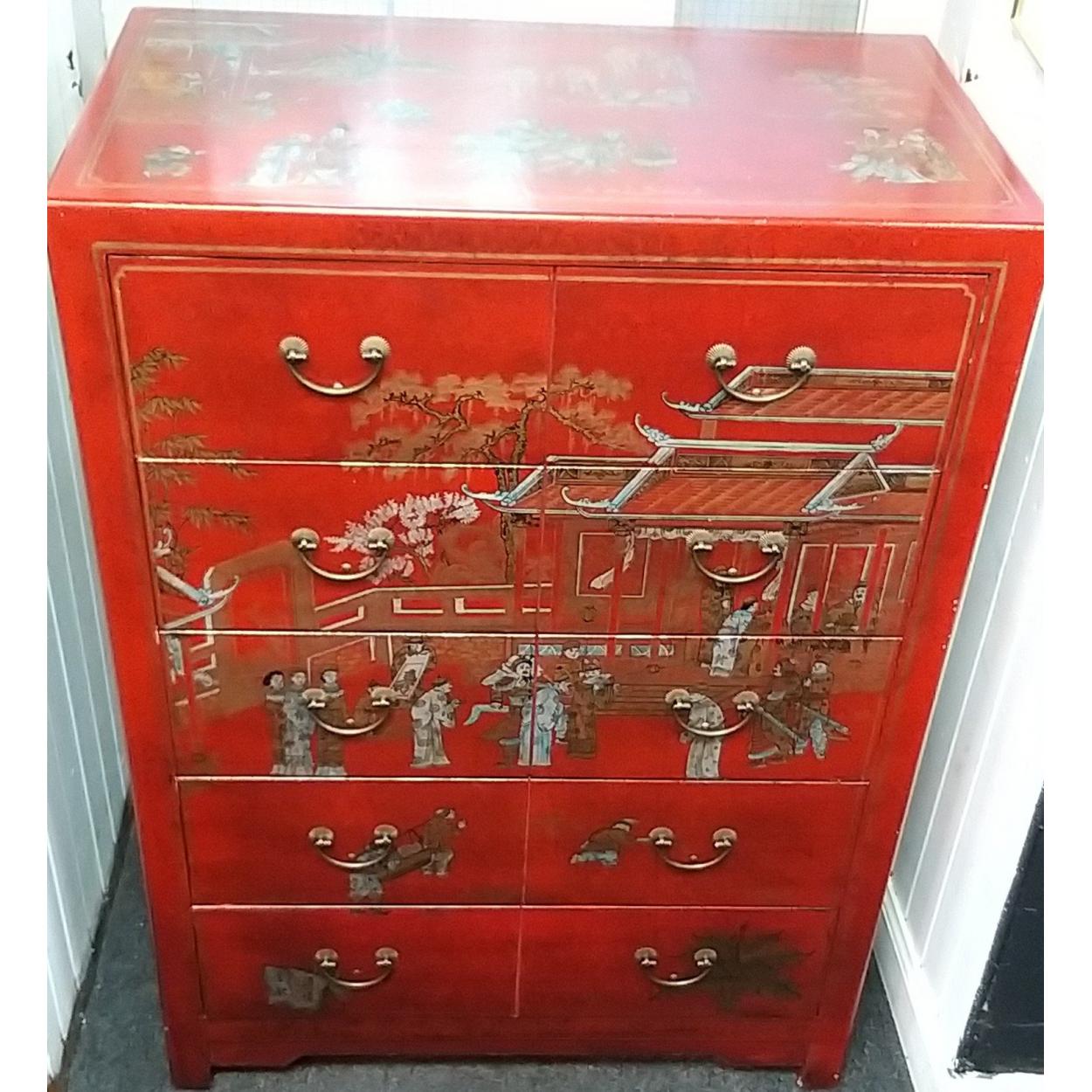Antique style Oriental red and black lacquered 5 drawer chest of drawers with multi-compartments for each drawer - dimensions 75cm width x 50cm depth x 105cm height approx