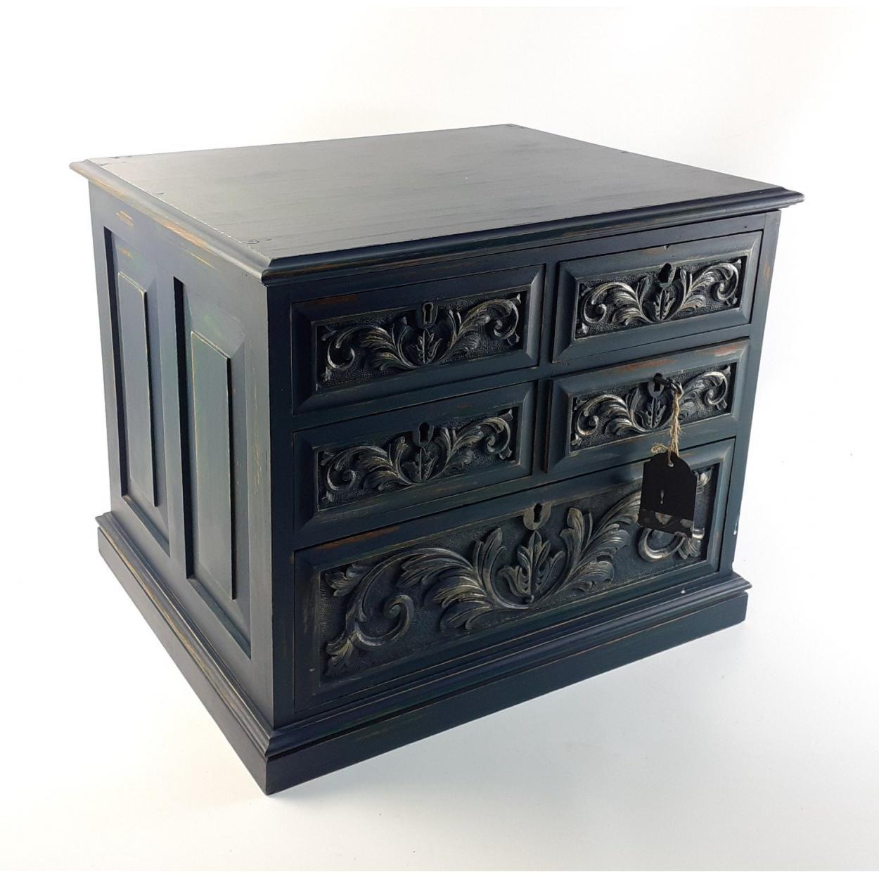 A beautifully restored wooden cabinet 4 drawers over 1, with fern highlights to drawers. Measures 46 x 38 x 38cm approx. Comes with key