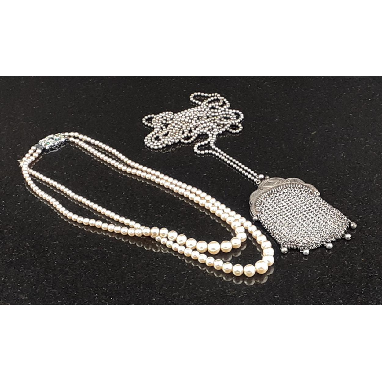 A small quantity of jewellery to include a small white metal coin purse on a long chain (140cm approx), plus a twin strand of pearls marked LOTUS (40cm approx)