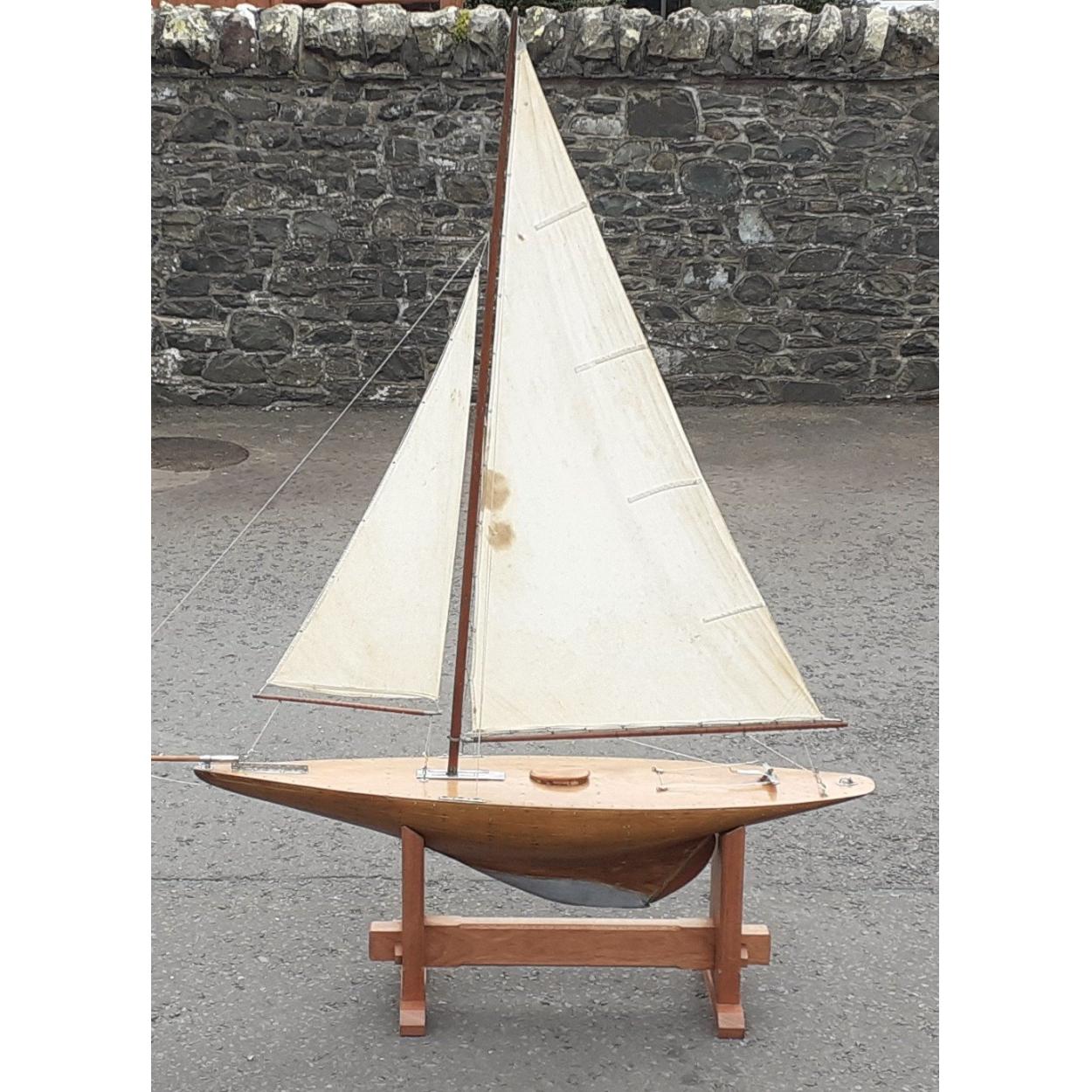 A magnificent large antique pond yacht on bespoke display stand. This beauty is fully rigged and so well made. The mast is 150cm and the whole stands over 2m tall approx with the stand. Some age related staining to the sails but it truly is a stunner!