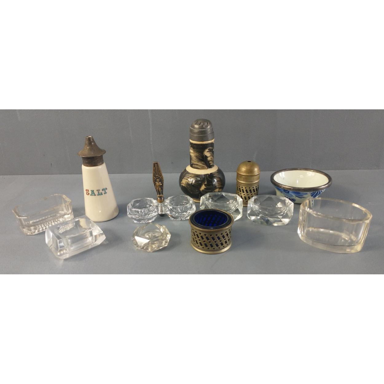 SALTS! A great collection of small and interesting salts to include a ceramic shaker, a DELFT dish and a small unusual dish with decorated brass handle.