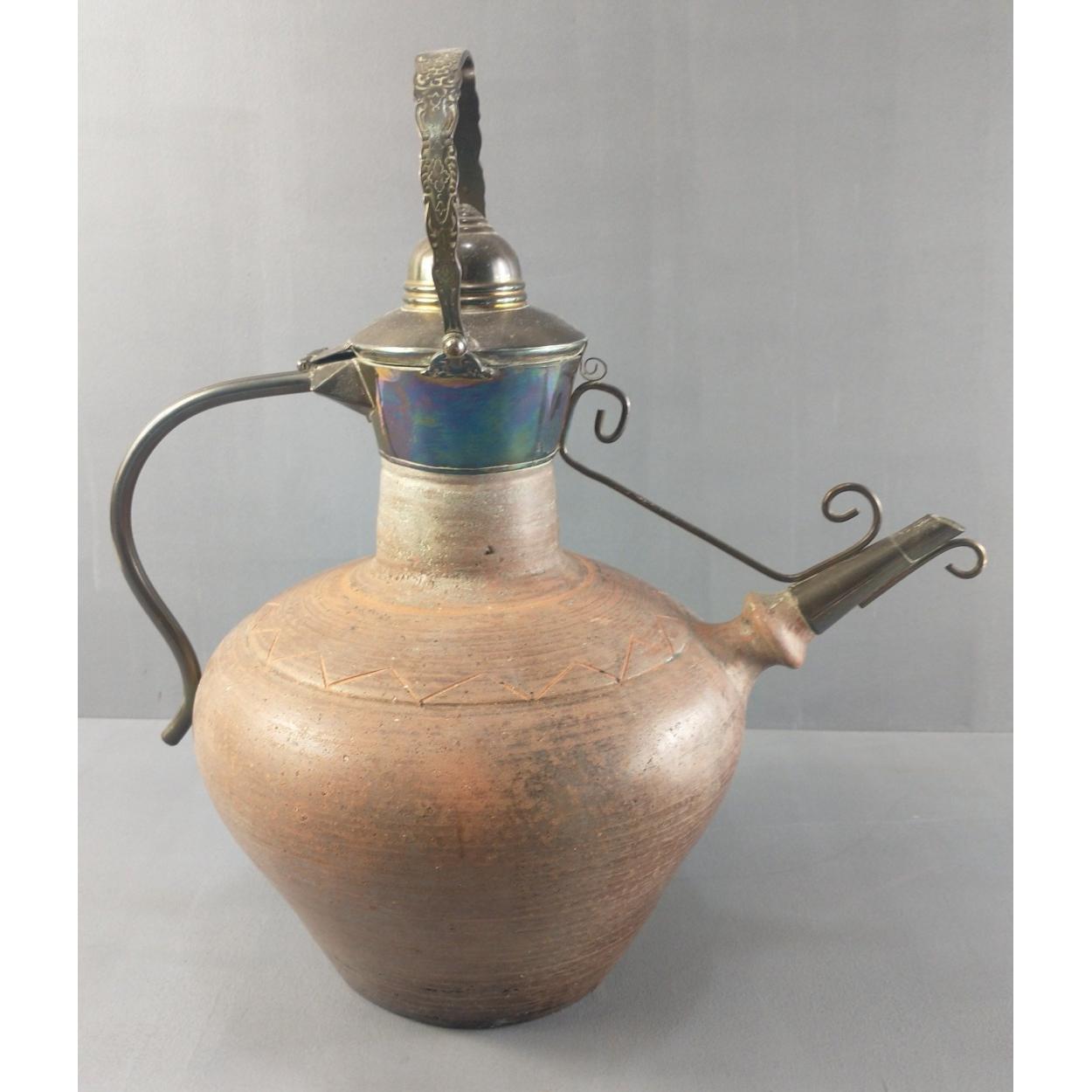 A terracotta water pitcher with metal handle, lid and spout. Stands 35cm approx