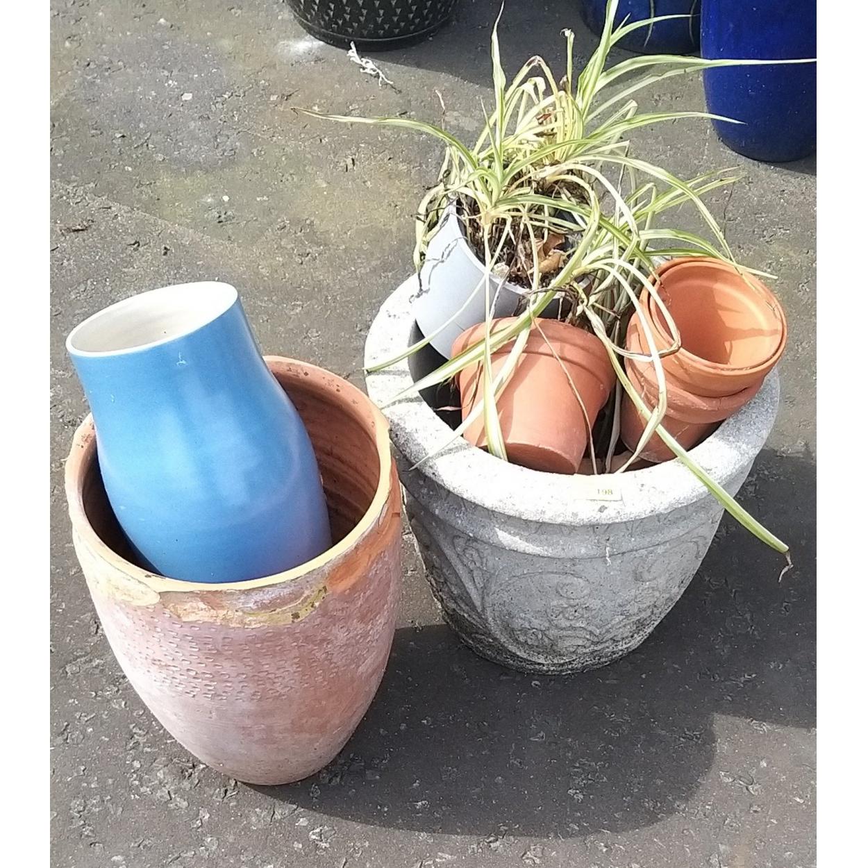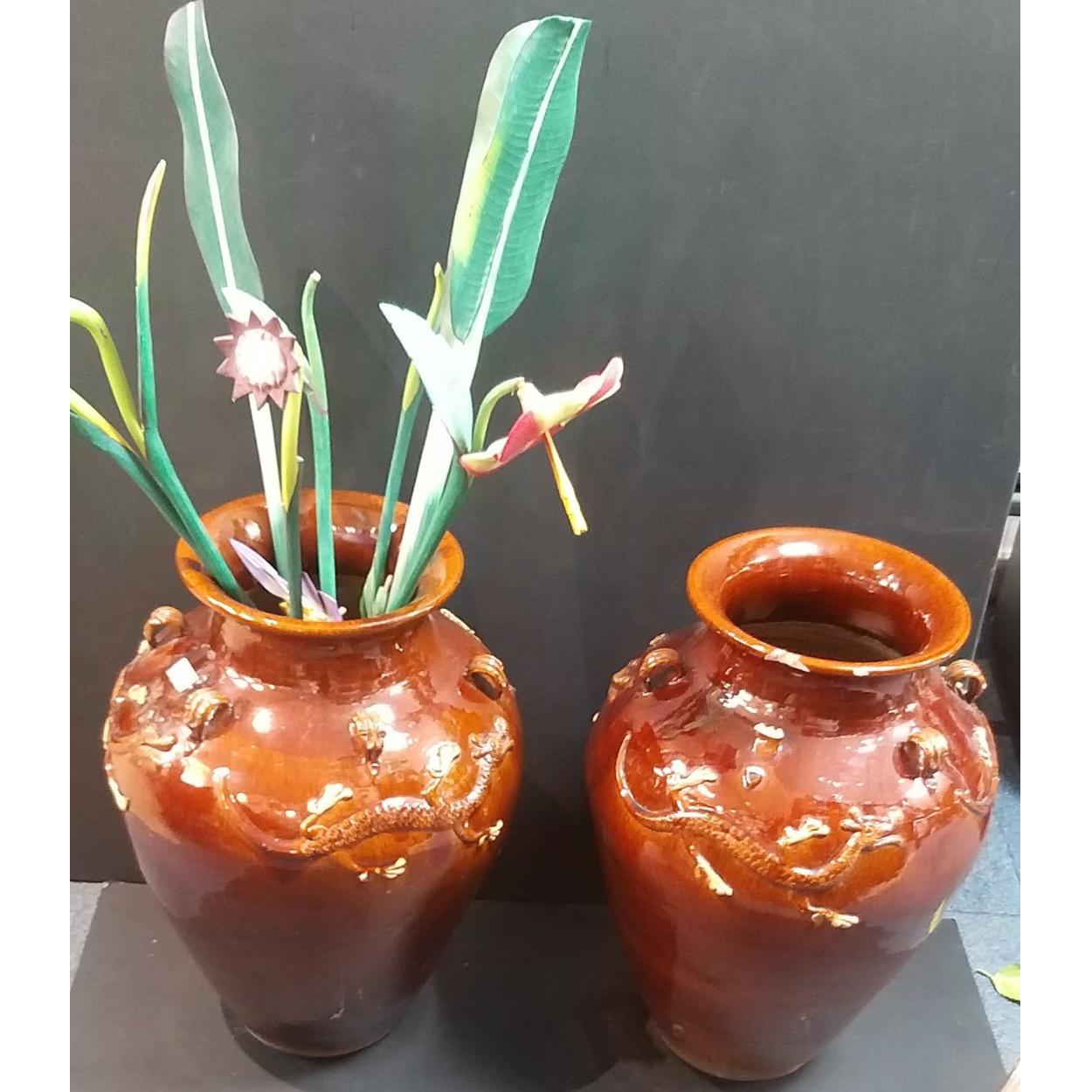 A pair of substantial highly-glazed dragon decorated pots, each 60cm tall approx, historical chip to one and broken handle. Both in same area so can be kept hidden from view.