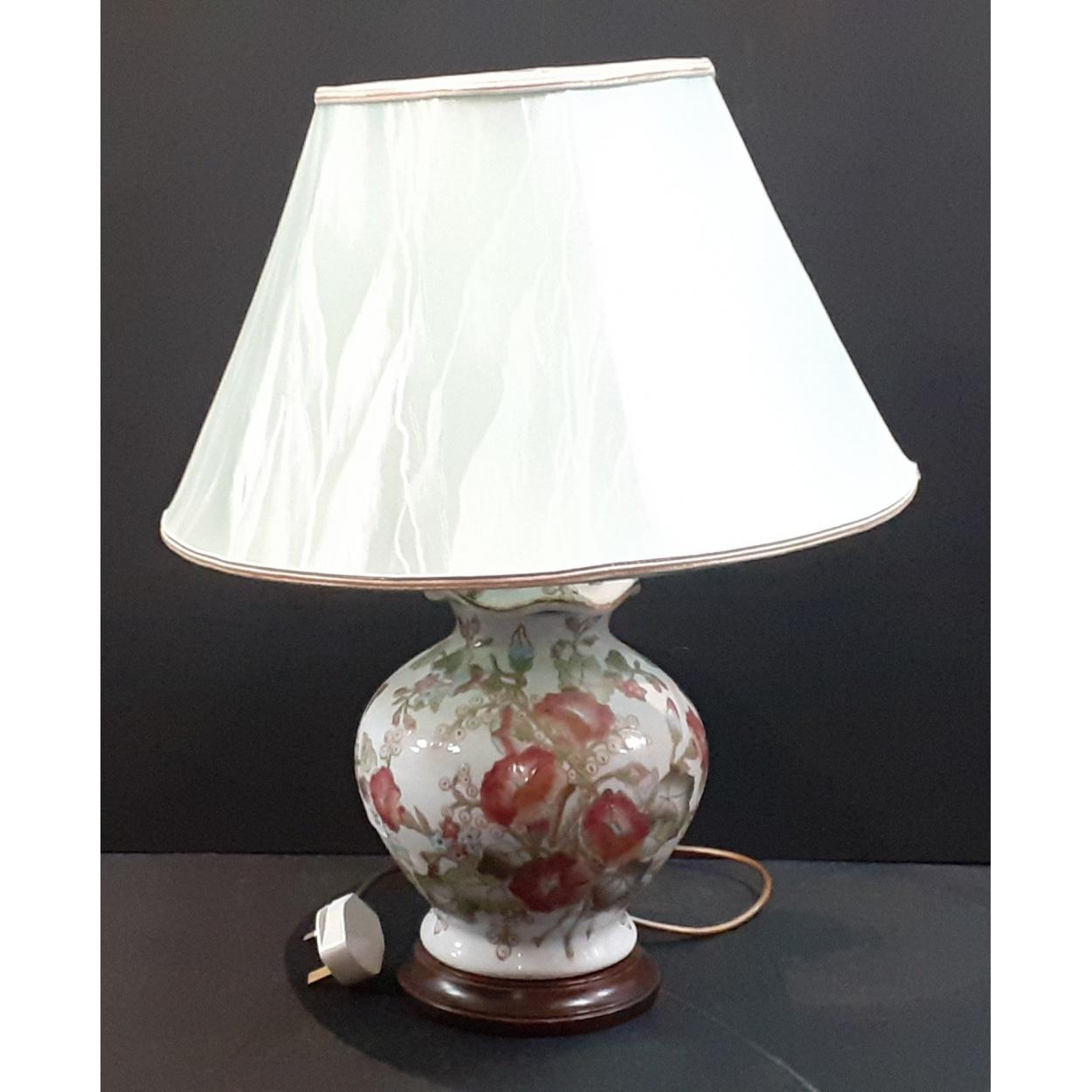 An Oriental floral decorated ginger jar style lamp with shade. Stands approx 44cm exc. shade.
