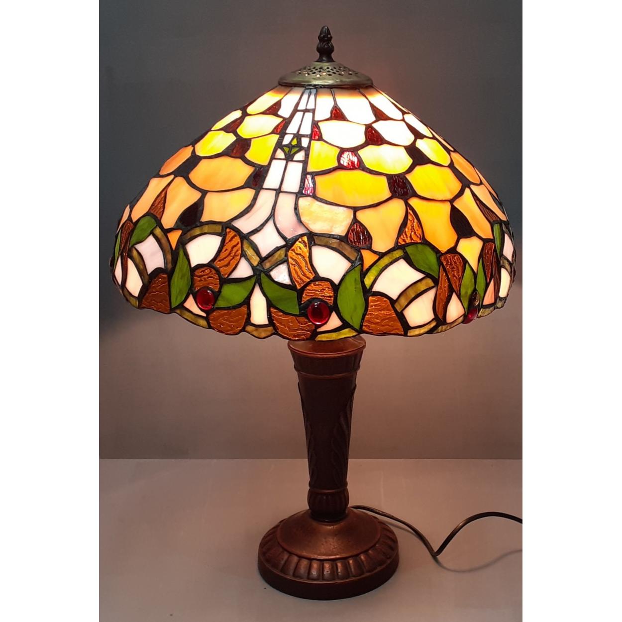TIFFANY style table lamp with nice bronzed effect base and colorful shade with cabochon glass beads. Standing 60cm tall approx and in lovely condition.