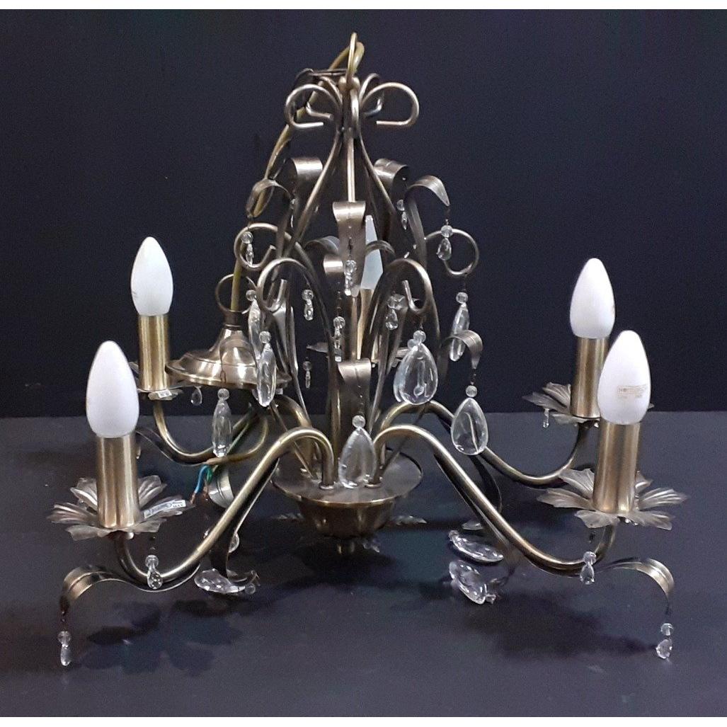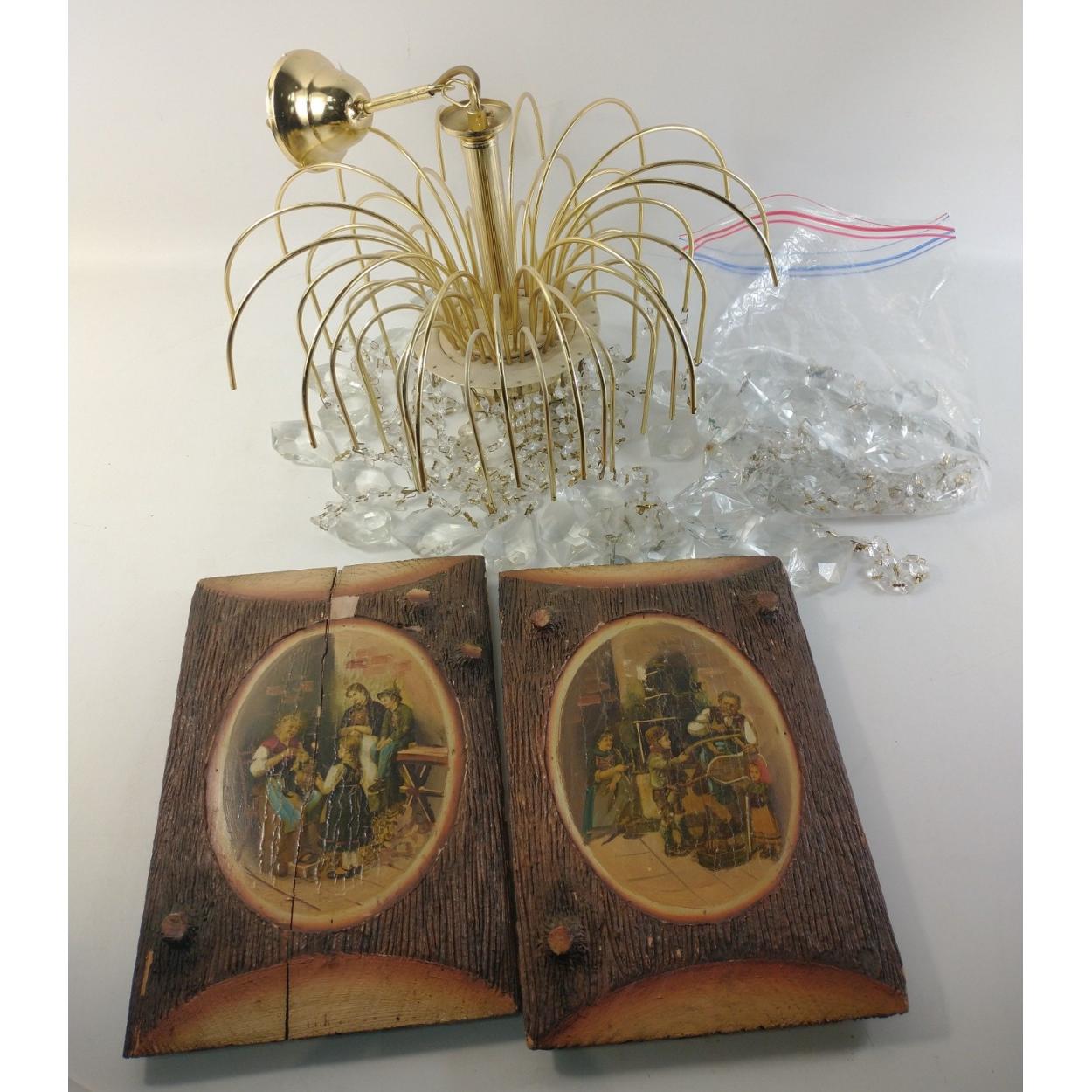 A brass effect chandelier ceiling lamp with attractive glass droppers. Approx 40cm across. With two unusual painted wooden wall plaques.