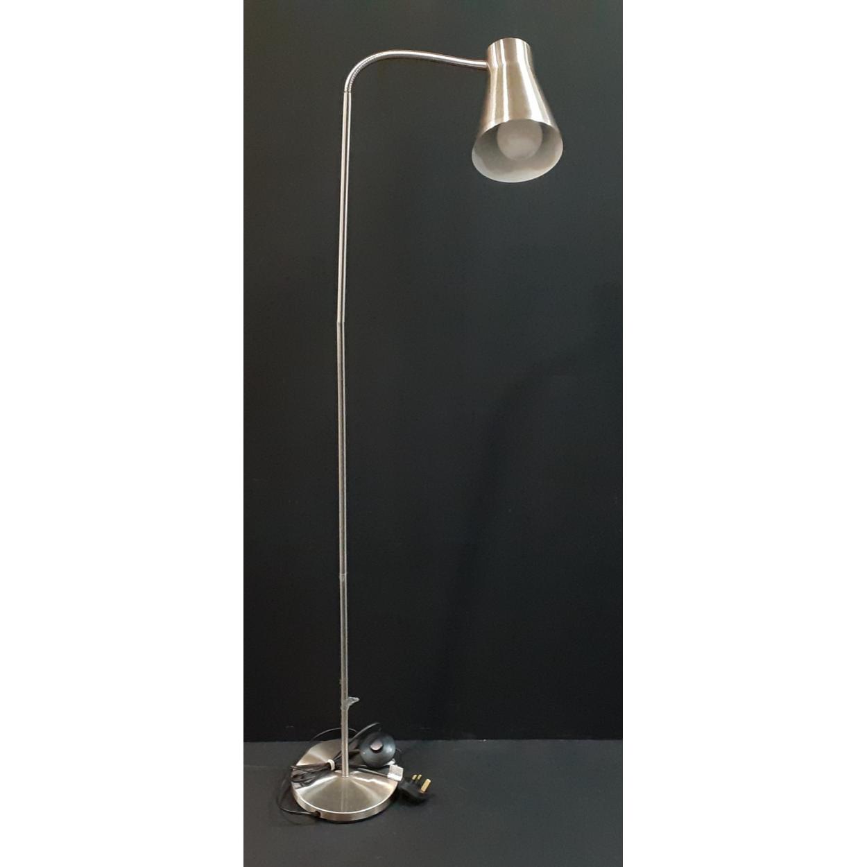 A modern free standing brushed chrome angled floor lamp, stands 150cm tall approx