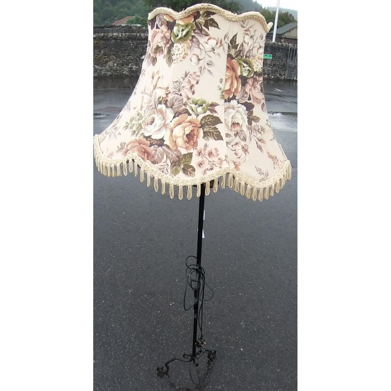 A wrought iron standard lamp in good condition. Electrified, with a modern shade. Stands 159cm approx.