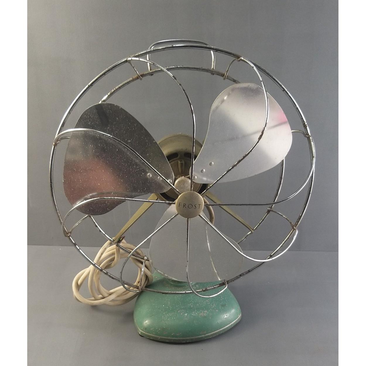 A vintage FROST & Co. Engineers Industrial metal three blade cool air fan. Patination overall and a rewire would be recommended but a great retro look. 35cm circumference, stands 43cm approx.