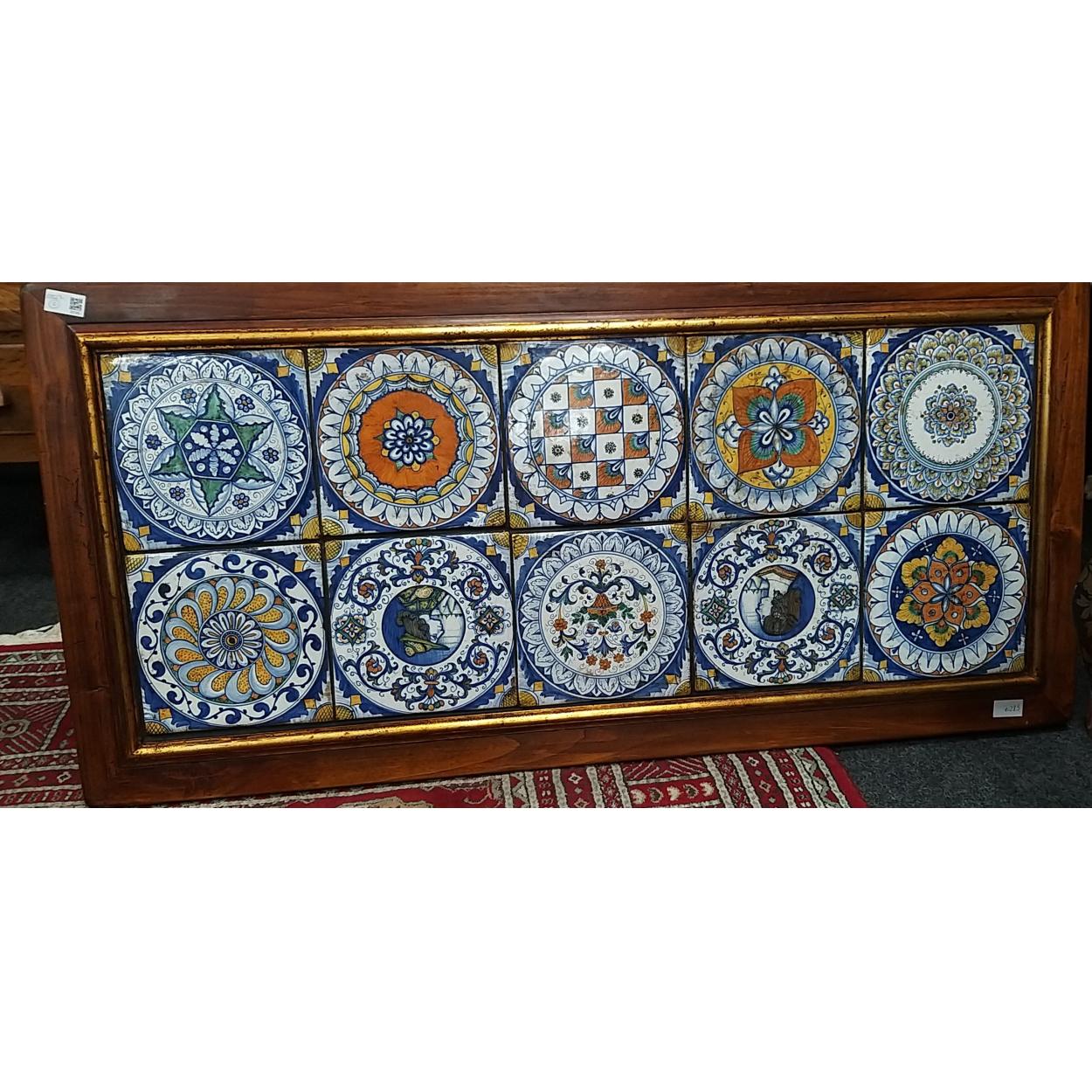 A large wall hanging with wooden frame comprising 10 ceramic tiles 117 x 57cm approx