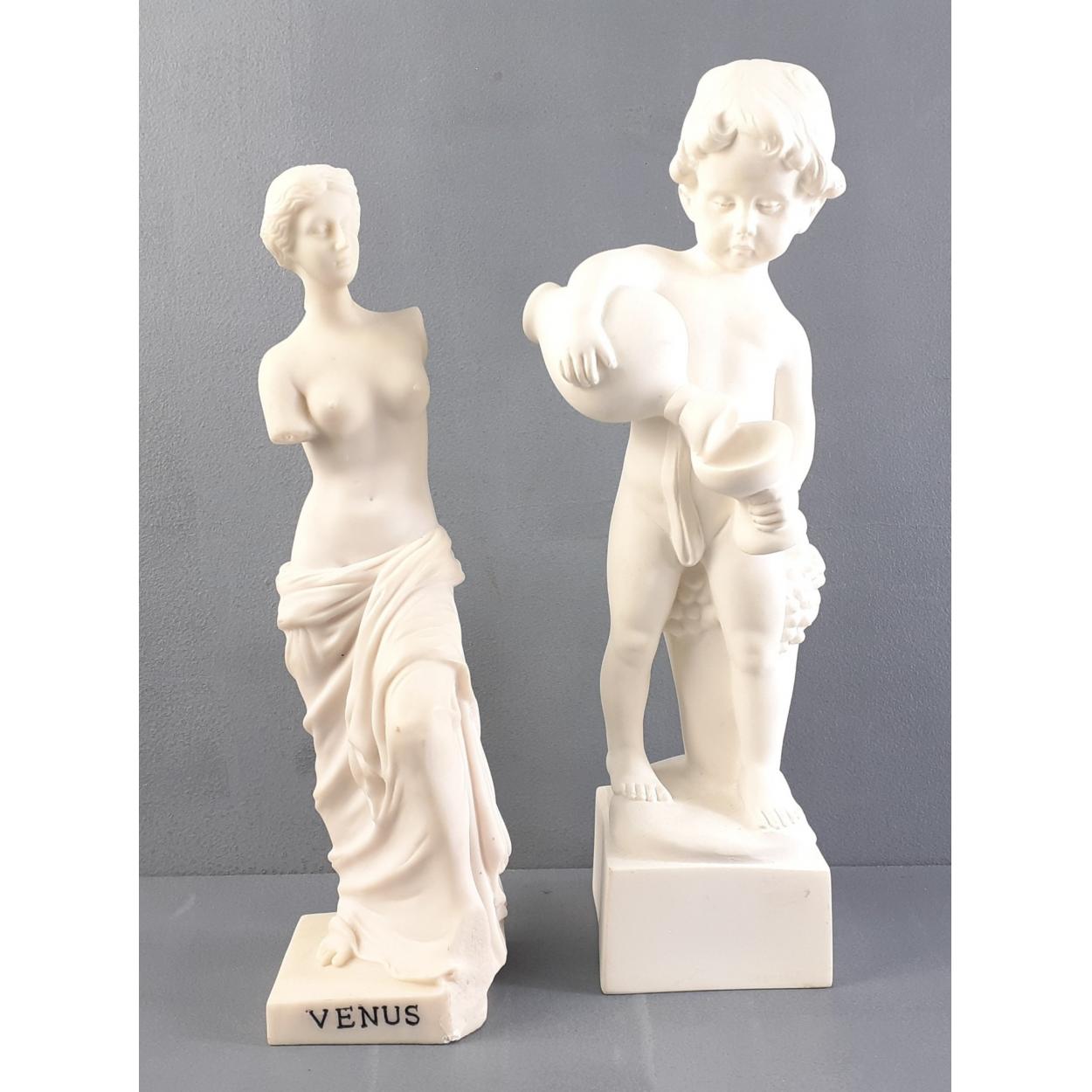 Two white stone figures. Venus and Cherub. The Cherub stands 26cm tall approx.