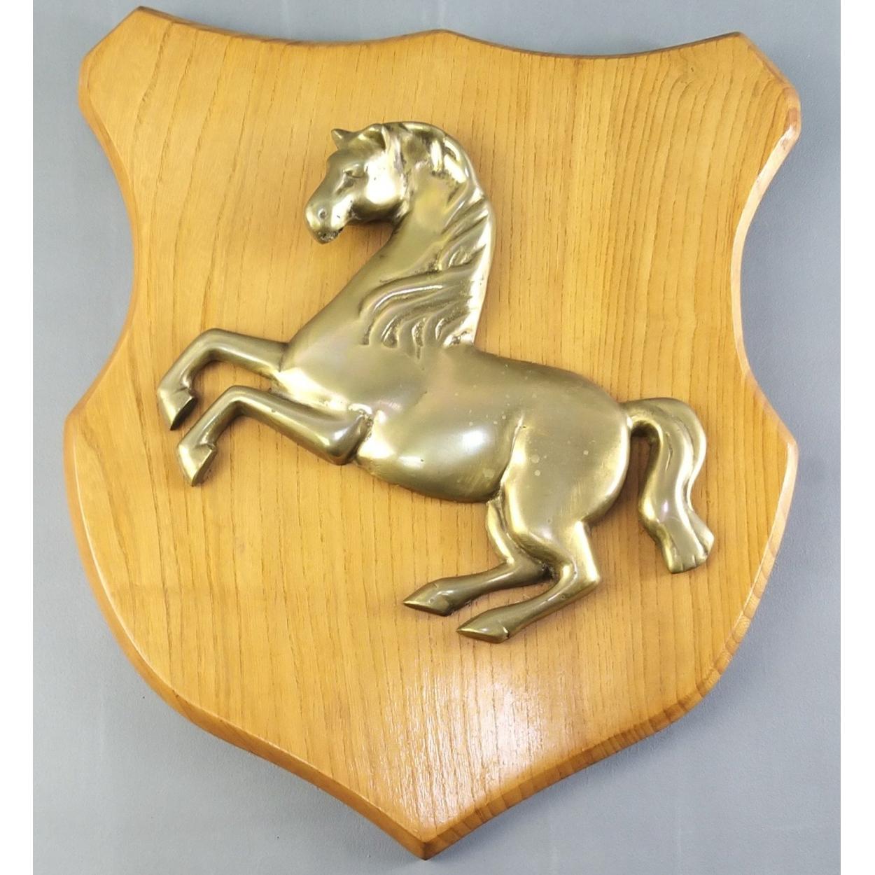 A superb wall shield with a nicely sculpted brass central prancing horse. Shield measures 35cm high approx. An intriguing and interesting piece.