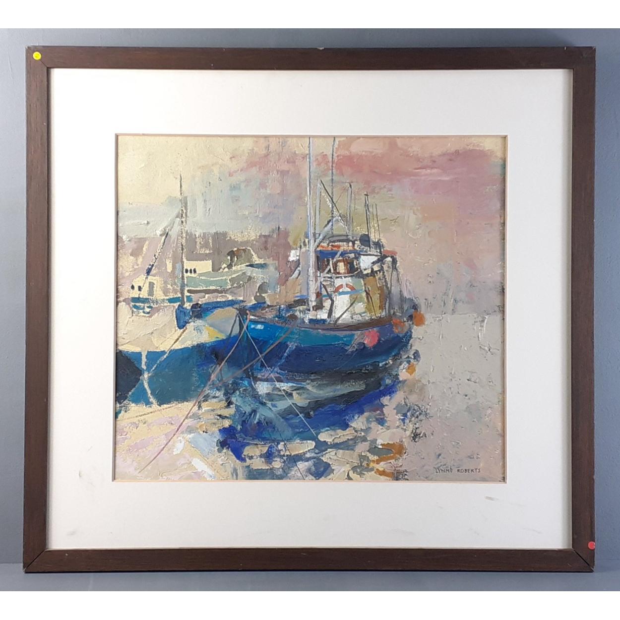 LYNN ROBERTS. Acrylic on canvas. Accomplished Highland Harbour scene with trawler. Loose in frame 55cm x 60cm approx.