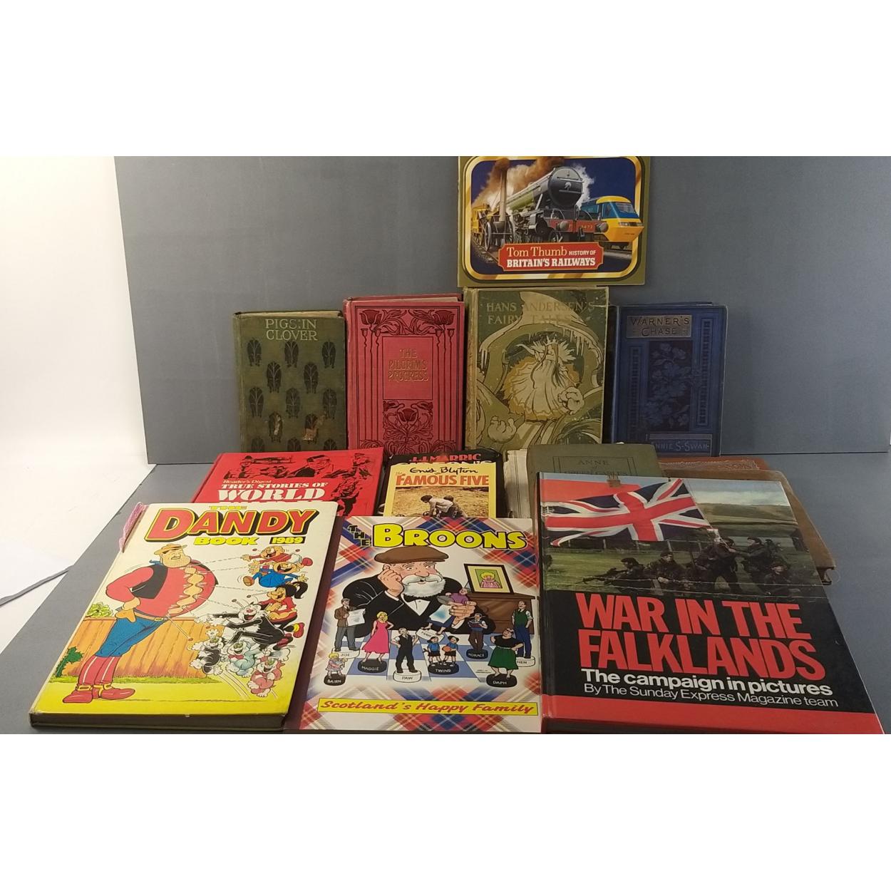 A small collection of books to include THE PILGRIM'S, published James Nisbet & Co (1878?), red cloth binding with gilt lettering, gift inscription in front, no loose pages, firm binding. PIGS IN CLOVER by Frank Danby, green cloth cover, lettered in gilt, and decorated with pigs and clover in black and bronze, published Heinemann 1903 (2nd impression). Cover dirty, fair condition. HANS ANDERSEN'S FAIRY TALES, A&C Black,1912 (reprinted 1917), fair condition, and WARNER'S CHASE by Annie S Swan plus various others including The Broones and The Dandy Annual etc