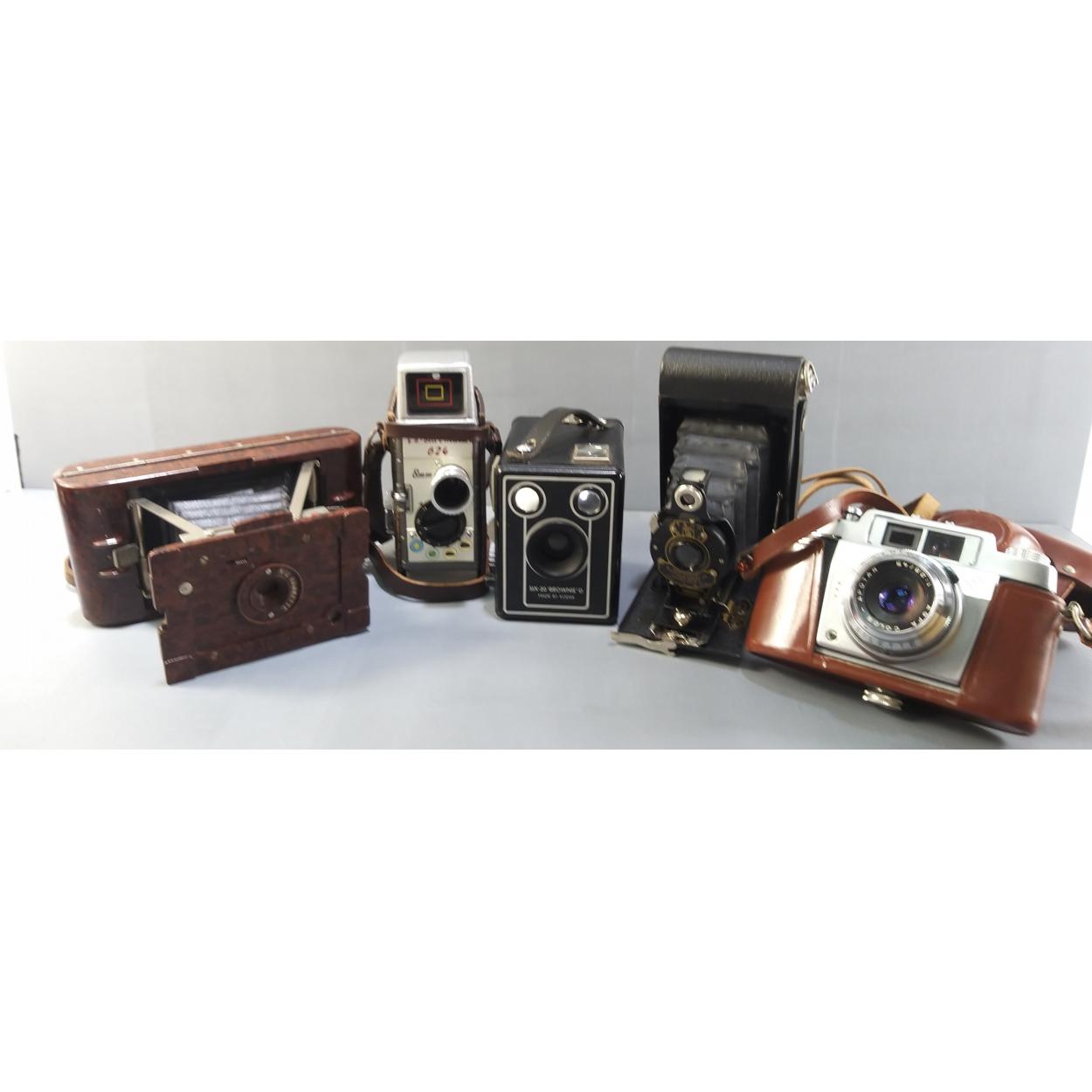 A selection of vintage cameras to include a Bakelite Hawkette in good order, a few folding cameras, a box brownie, AGFA, Bell & Howell movie camera etc.