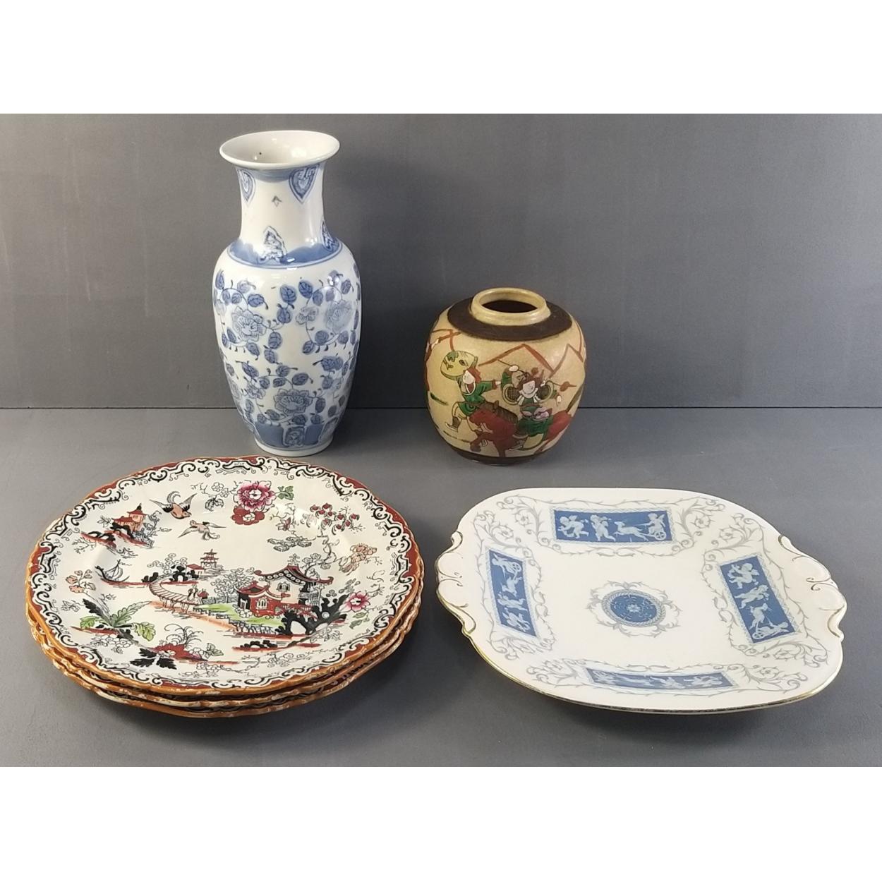 Three Oriental style plates by ASHWORTH BROS, each 26cm approx, a square blue and white COALPORT plate and a hand-painted Chinese vase 25cm tall approx. Plus also an Oriental vase approx 15 cm tall.