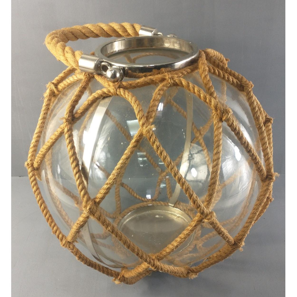 A braided rope glass globe hanging lantern 36cm tall approx. No cracks or fraying to rope etc.