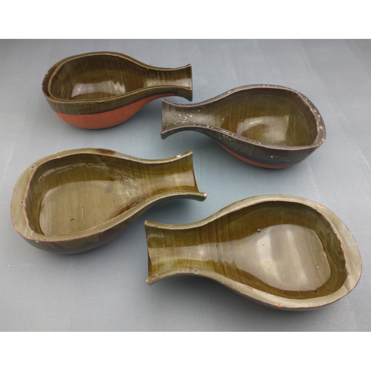 Four green handled terracotta bowls, each 14cm long approx
