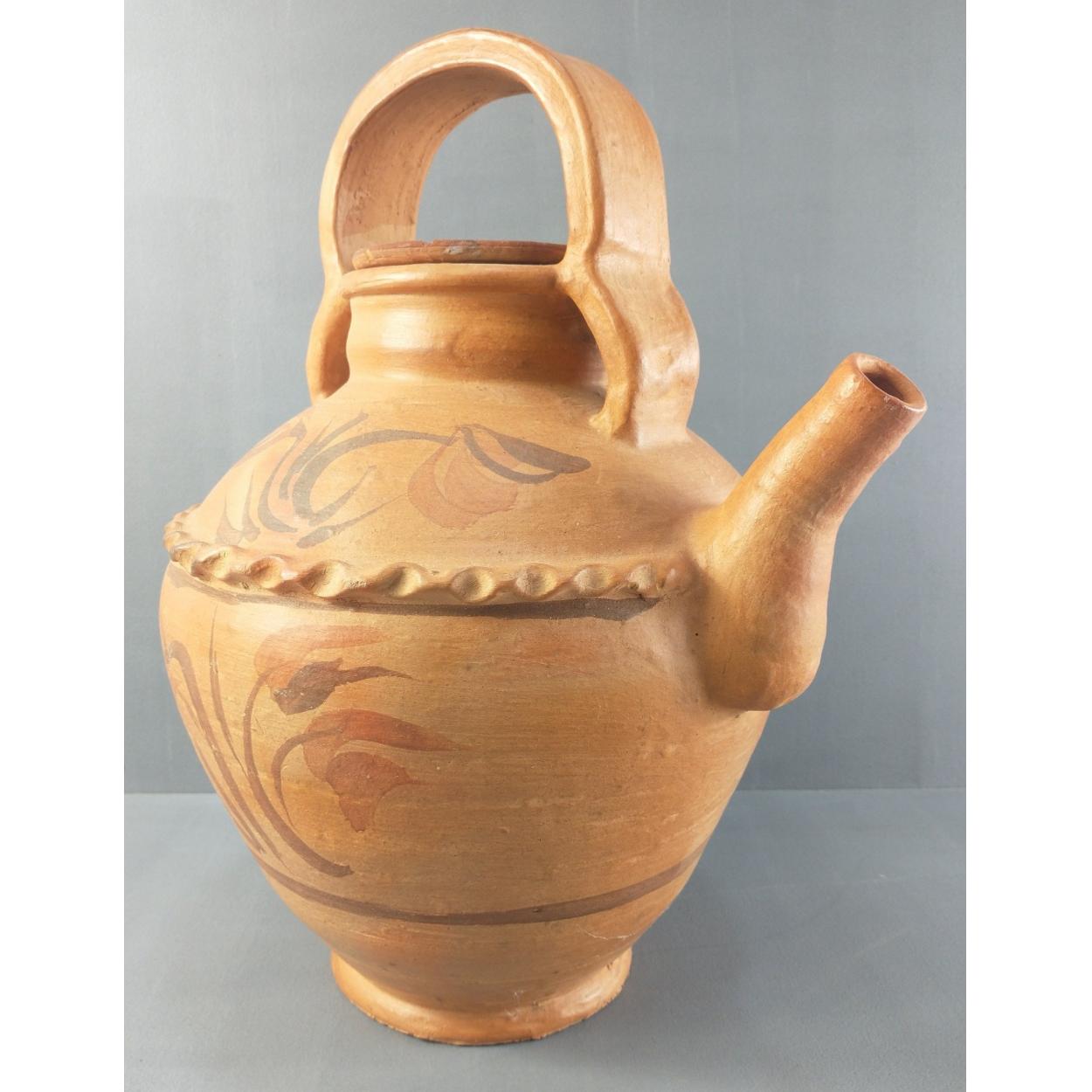 A large terracotta lidded water pot with hand-painted design. Stands 38cm high approx. Minor nibble noted to the lid.