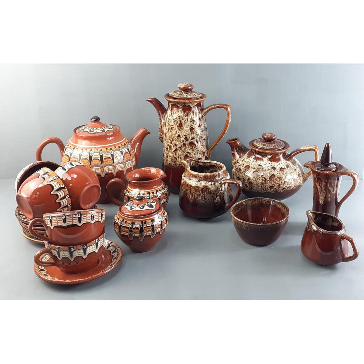 A good collection of glazed pottery tableware pieces to include coffee pot, tea pots, milk jugs etc. All in good condition. Some marked FOSTERS.