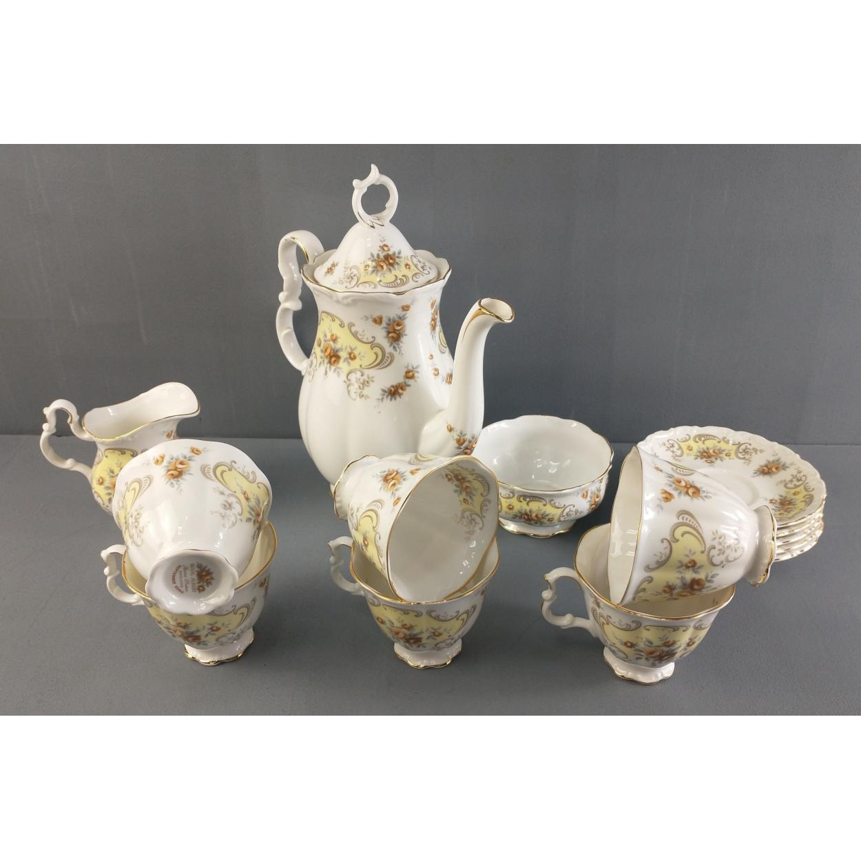 ROYAL ALBERT SEPTEMBER SONG part coffee set comprising coffee pot, six cups, five saucers, sugar & cream. All pieces in good order with no chips, cracks, rubbing to gilt.