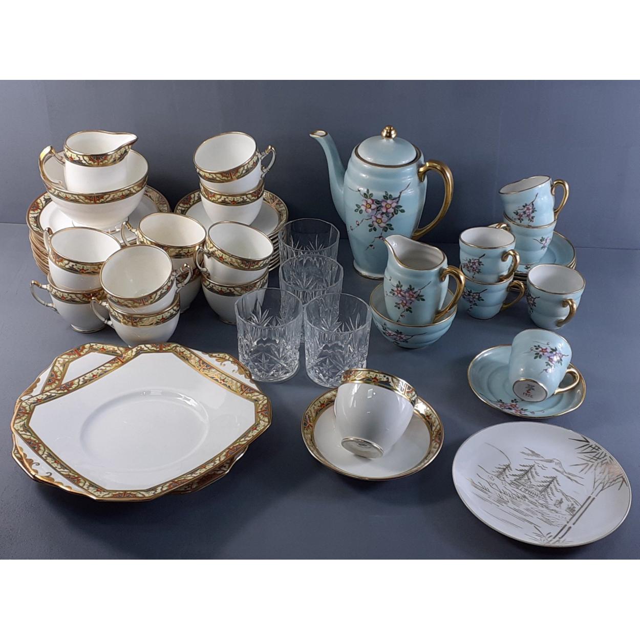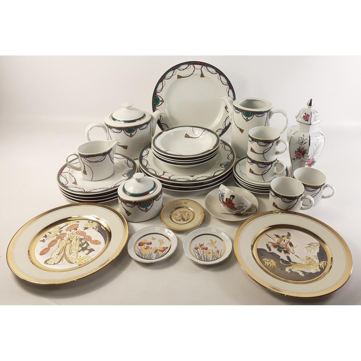 Mixed part dinner service pieces THAILAND pattern by ROYAL PORCELAIN, and other decorative items.