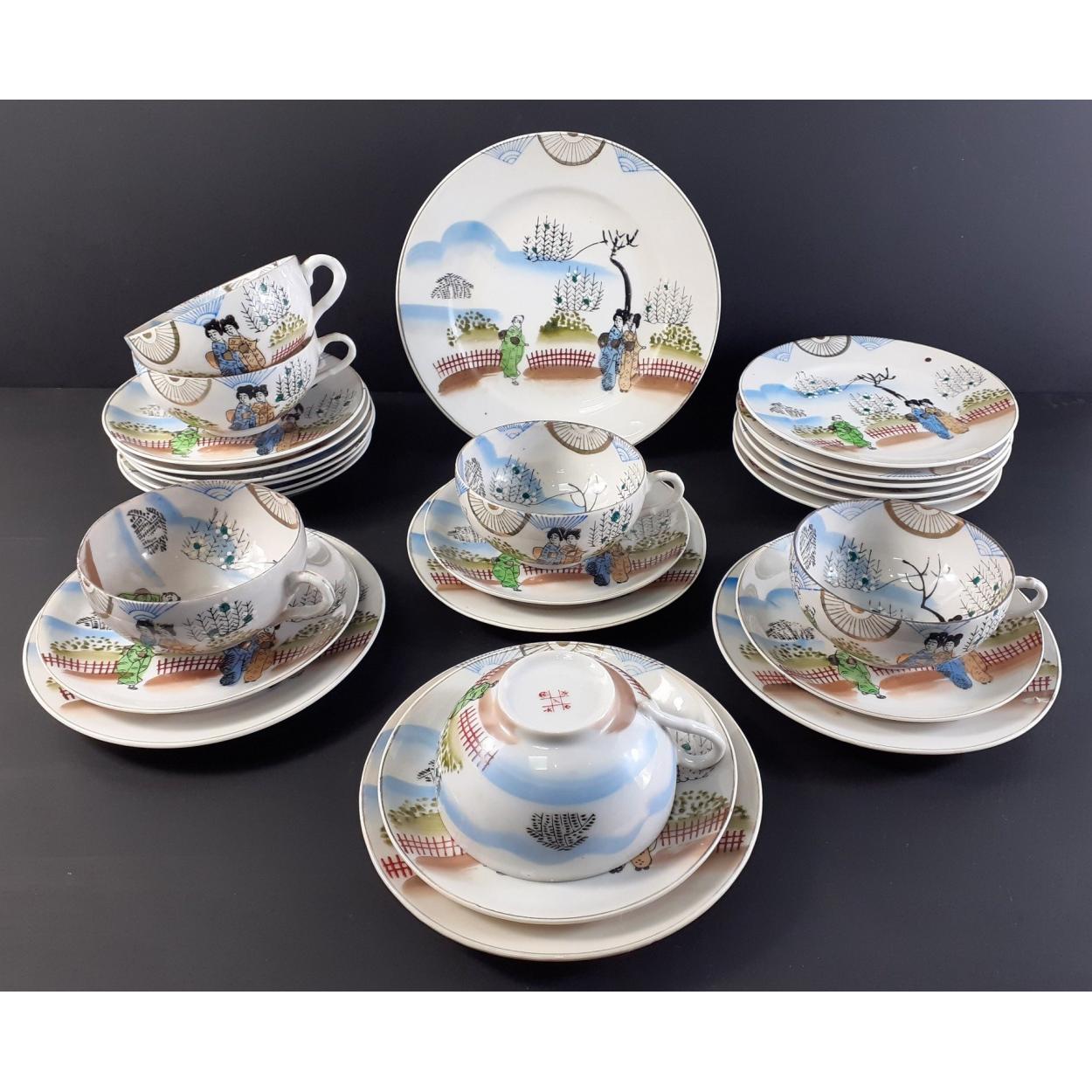 Oriental NORITAKE style tea service comprising six cups and saucers, ten side plates and a 19cm plate. Pretty set in good useable condition.