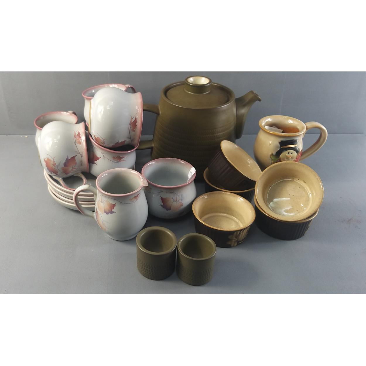 A box of DENBY ware to include TWILIGHT service comprising 6 cups, 4 saucers, milk and sugar, 5 BAKEWELL ramekins, a large teapot and 2 egg cups