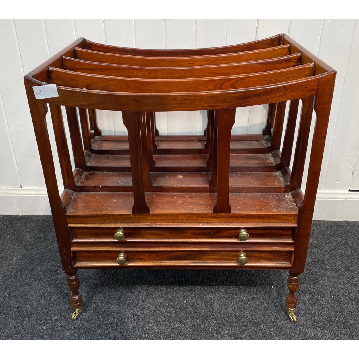 NICE QUALITY! A mahogany CANTERBURY with two drawers and brass castors - dimensions 2ft length x 18" depth approx