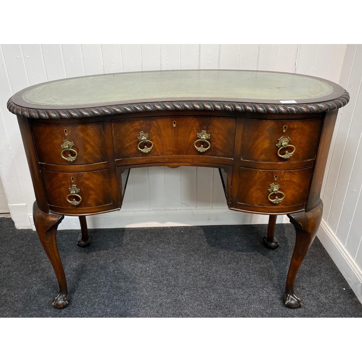 An EDWARDIAN inspired kidney form knee-hole correspondence desk with green leather pad and three over two drawers, with brass handles supported on ball and claw feet length 100cm x depth 45cm x height 80cm approx