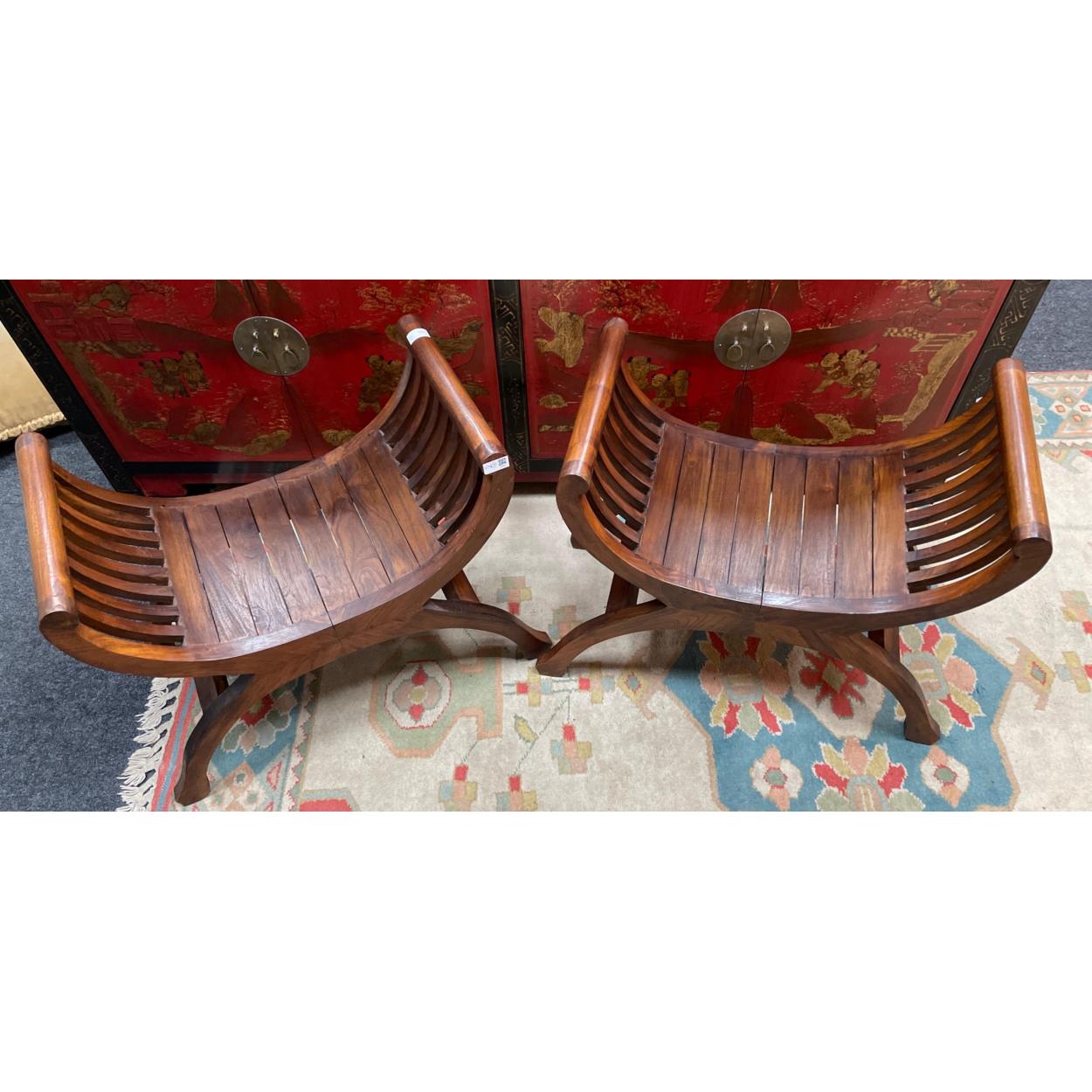 A pair of super quality mahogany cross-over LYRE seats - dimensions 72 width x 36 depth x 55 height