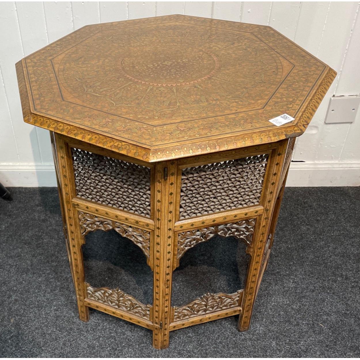 BEAUTIFUL QUALITY - An Indian 19th century inspired octagonal occasional table with brass and copper inlay and pierced folding wood work frame-work - dimension 61cm diameter approx