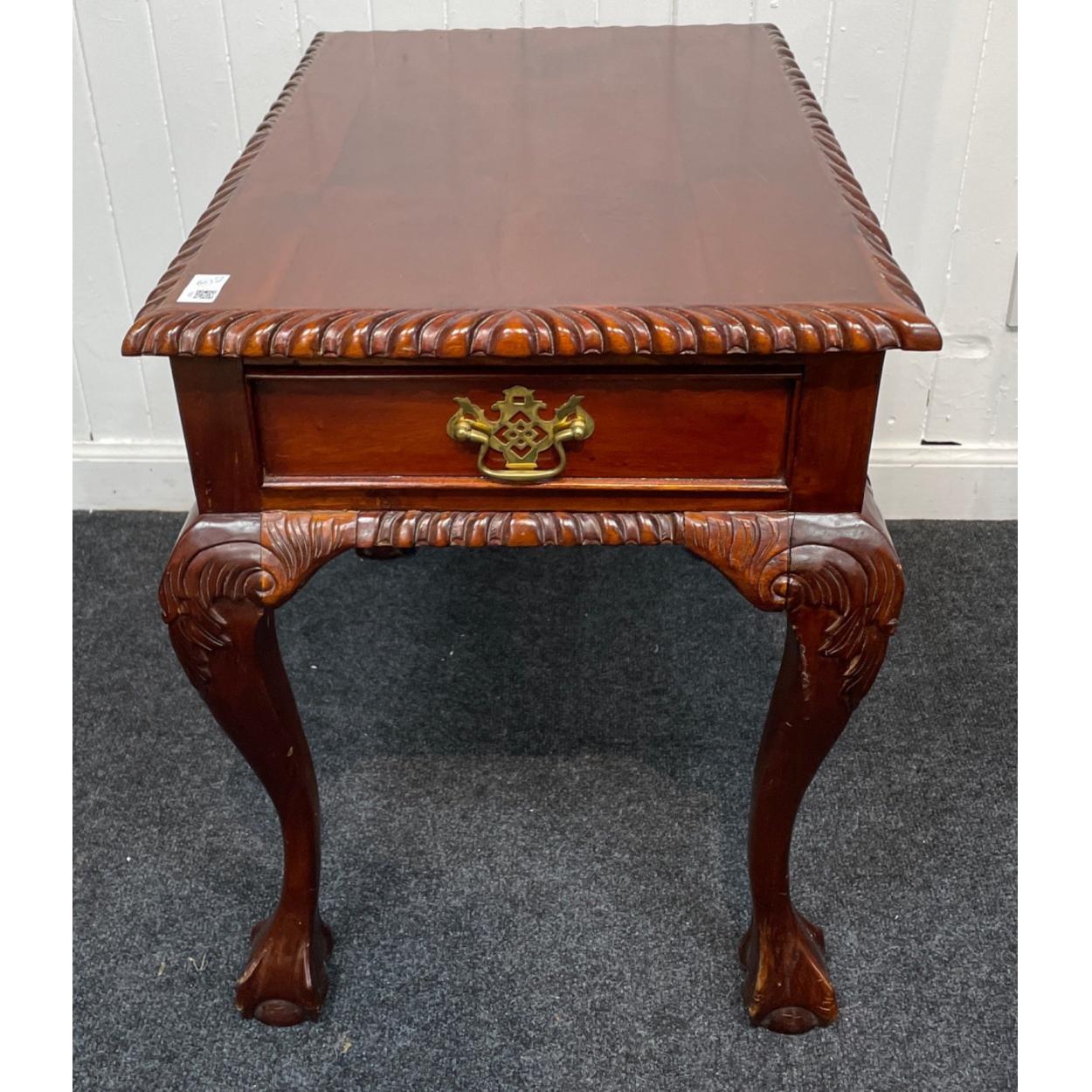 A mahogany effect rectangular coffee table with single drawer with cabriole legs on ball and claw feet - dimensions 60cm x 45cm x 60cm height