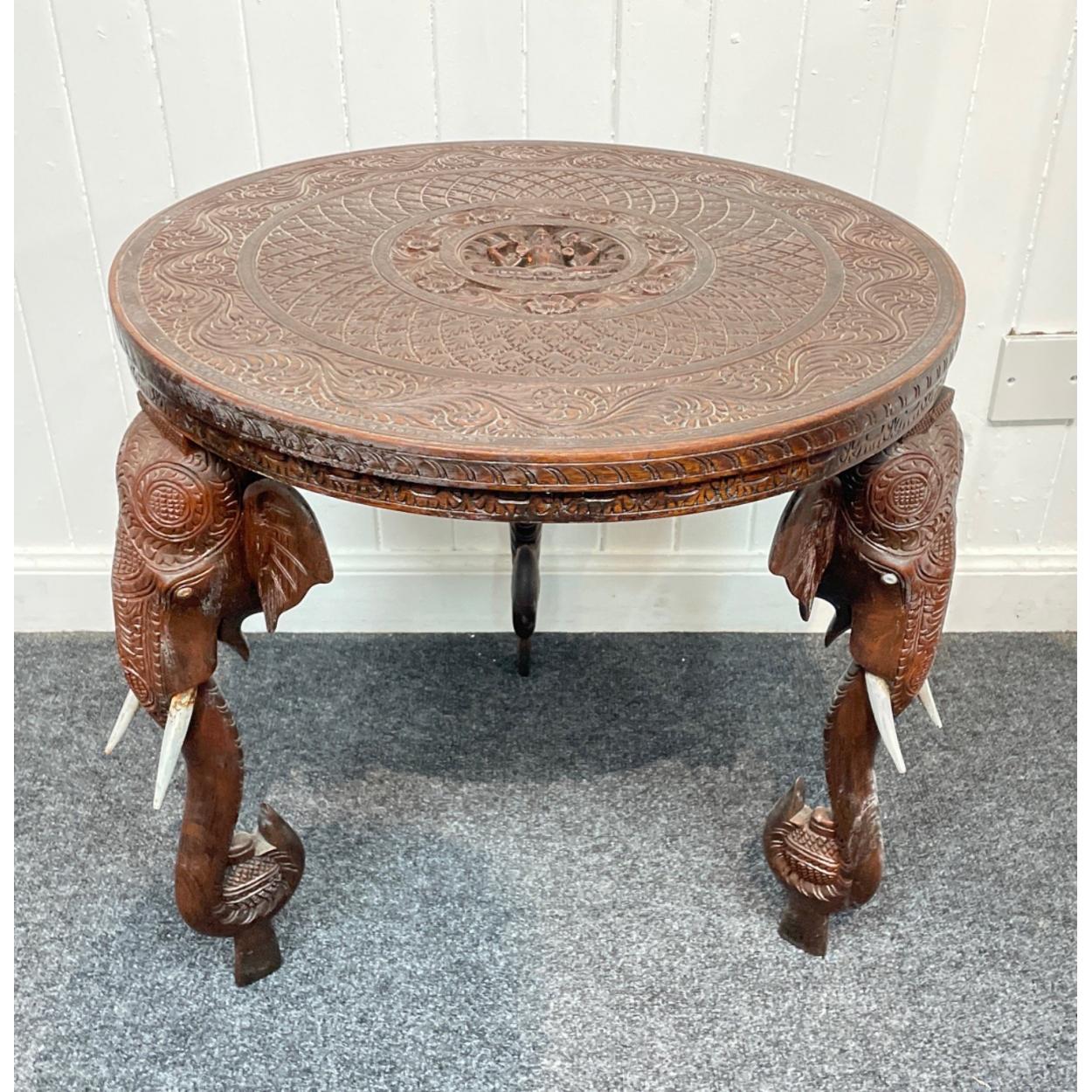 An INDIAN inspired hand carved side table with elephant head and tusks form legs - there is no ivory in this table only white wooden painted tusks and beads for eyes - the elephant form trunks also act as legs - dimensions 53cm diameter x 54cm height approx