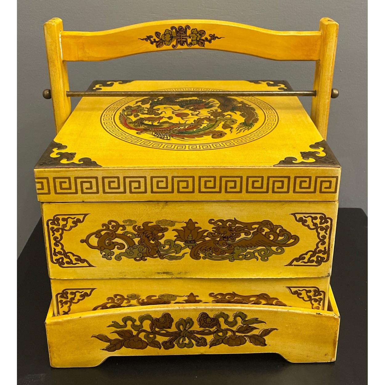 ORIENTAL decorative mild yellow traditional flora and fauna patterned and lacquered traditional inspired food carrier with handle - ideal for storage with haberdashery etc - new still in wrappers! unused item in storage
