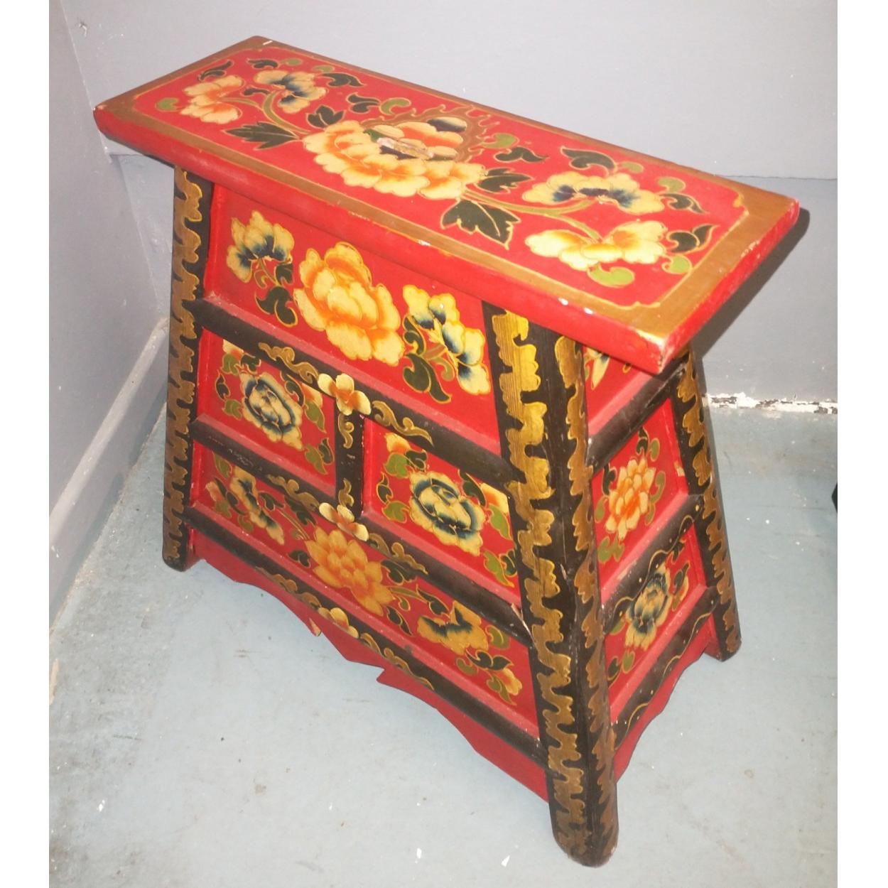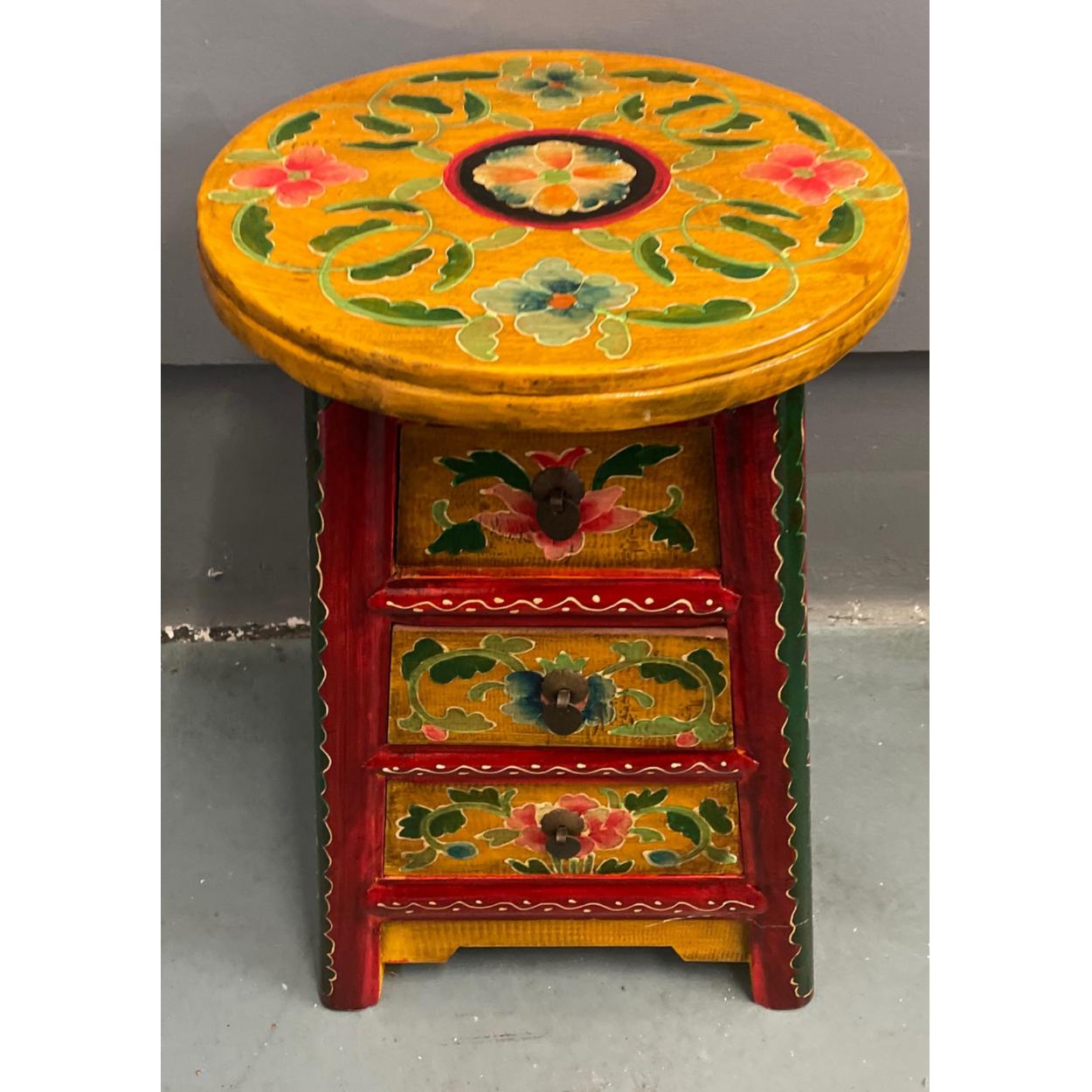 An ORIENTAL HIGHLY decorative yellow painted and floral lacquered red based 3 drawer stool/side cabinet - unused item in storage