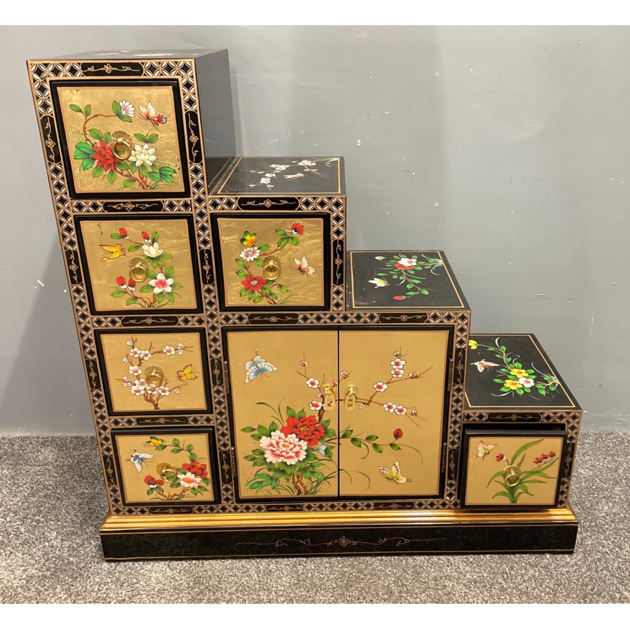 AN UNUSUAL STEPPED ORIENTAL decorative gold and black lacquered storage cabinet - black based with highly decorative floral patterns - 6 drawers and two door cupboard