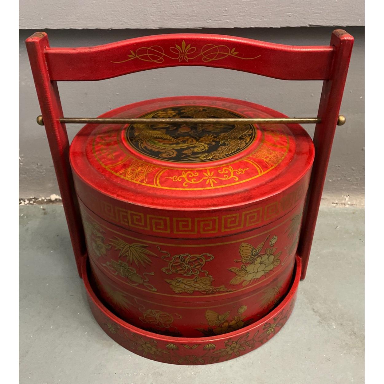 An ORIENTAL HIGHLY decorative red and gold painted lacquered layer with carry handle mock food carrier - new and unused item in storage