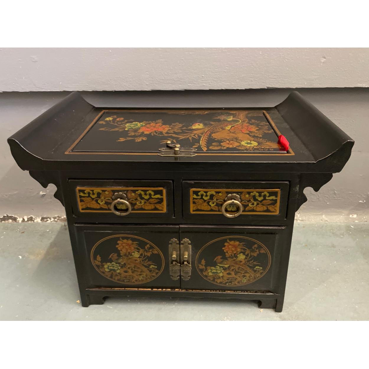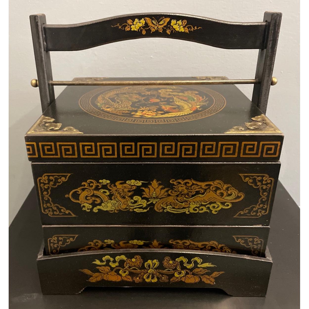 ORIENTAL decorative black and gold lacquered based drawer carry-handle cabinet - unused item in storage