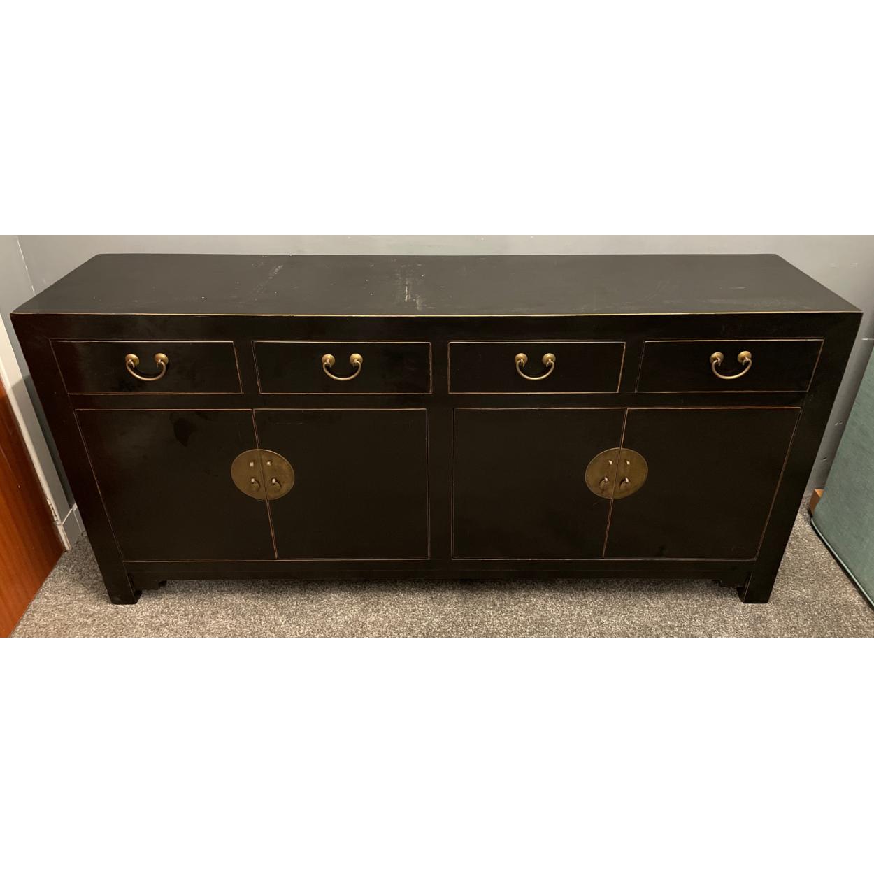 An ORIENTAL HIGHLY decorative black distressed-painted lacquered large four drawer and four door cupboard sideboard - new and unused item in storage - would make an ideal TV or media cabinet as well as great for storage!