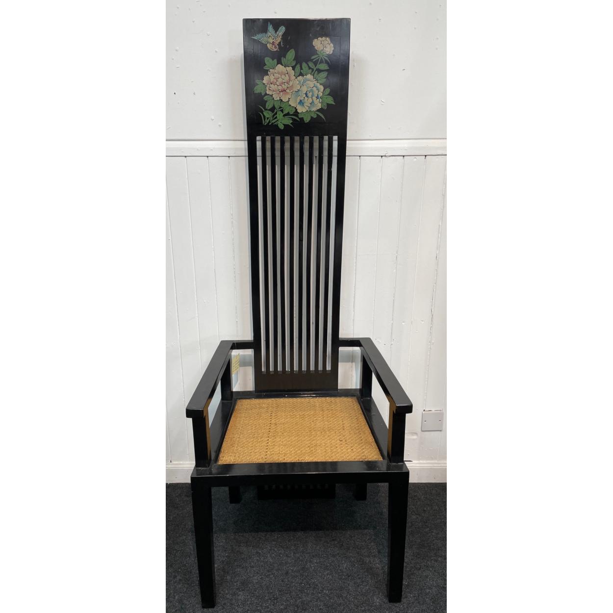 UNUSUAL! An ORIENTAL HIGHLY decorative black lacquered high backed oriental seat with a nice floral pattern - with a nice reed seat-pad - new and unused item in storage
