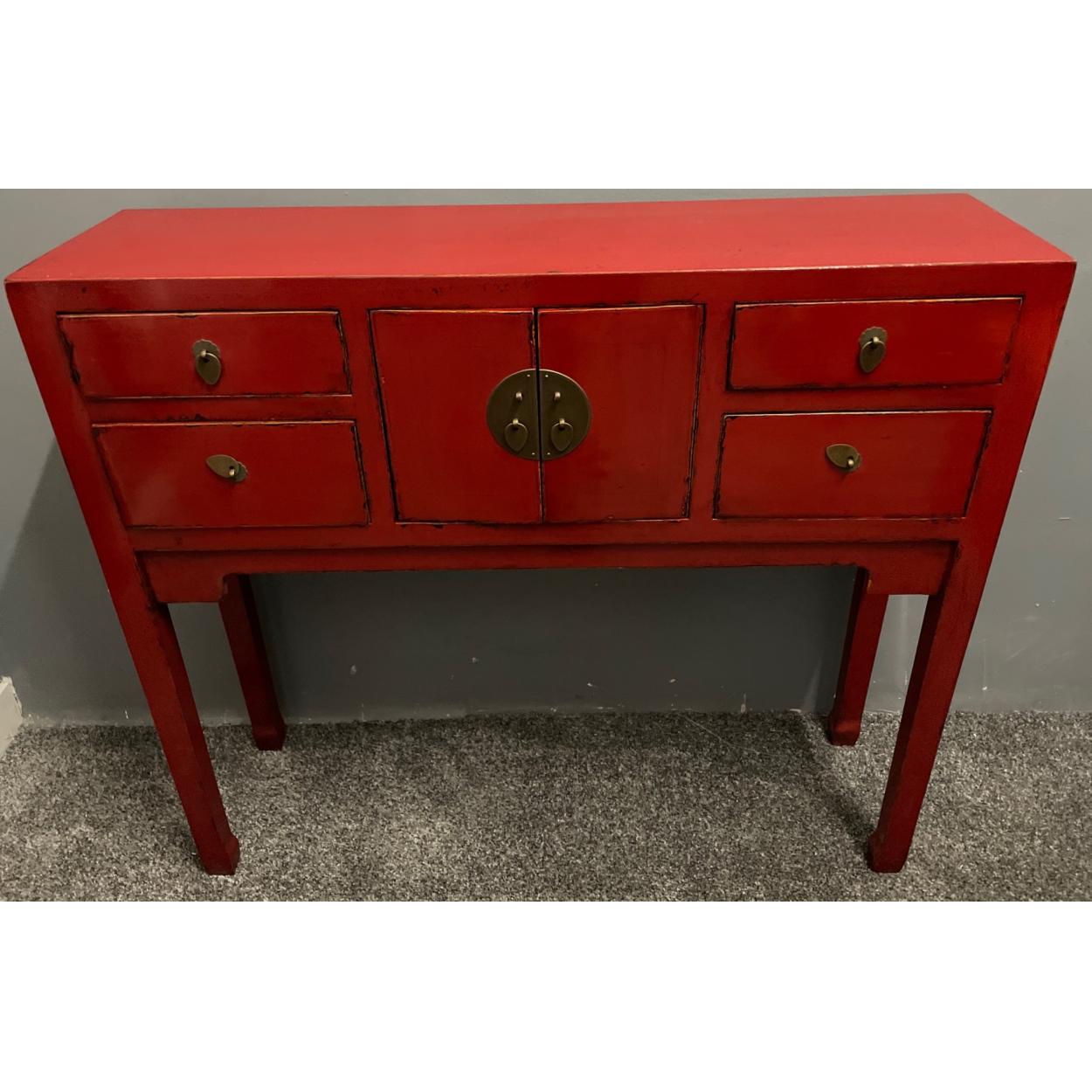STATEMENT PIECE ! - An ORIENTAL HIGHLY decorative red based distressed-painted lacquered large four drawer and two door cupboard sideboard - new and unused item in storage - would make an ideal TV or media cabinet as well as great for storage!