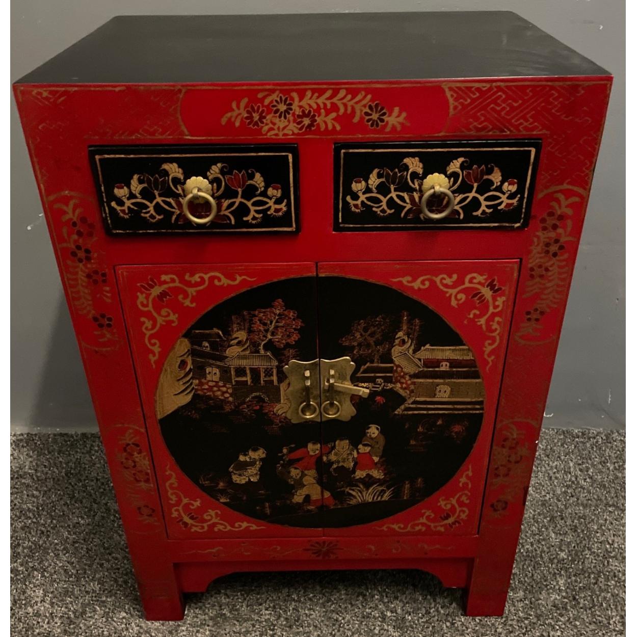 ORIENTAL decorative red and black traditional design lacquered red based two door and two drawer side cabinet - new still in wrappers! unused item in storage