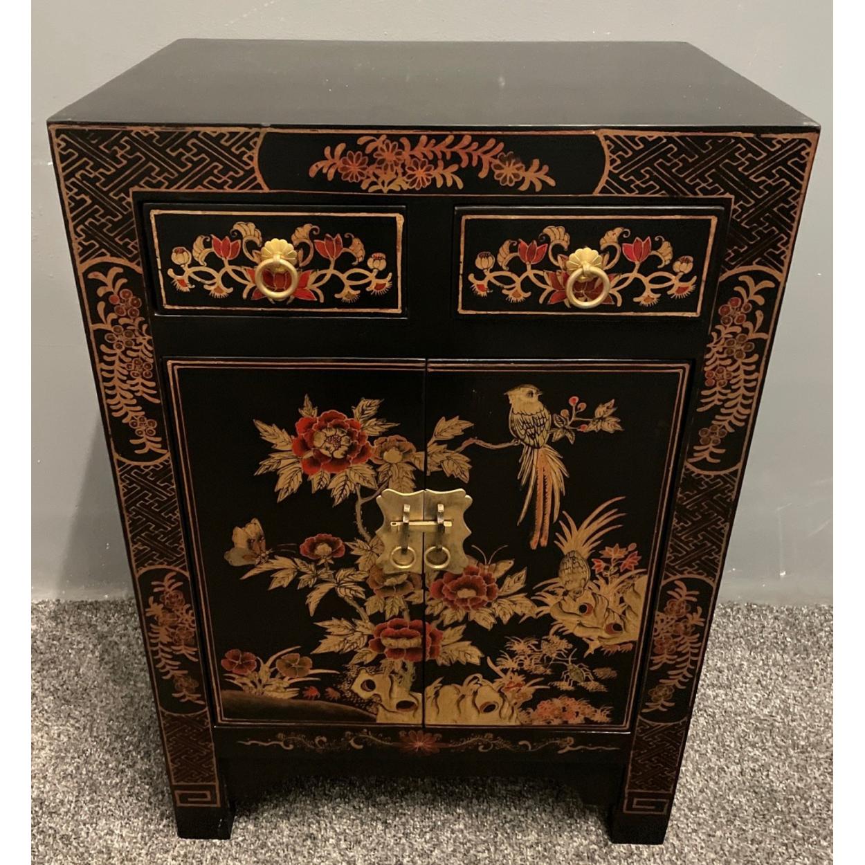 An ORIENTAL HIGHLY decorative black and gold painted and floral lacquered black based 2 drawer stool/side cabinet - as new unused item in storage
