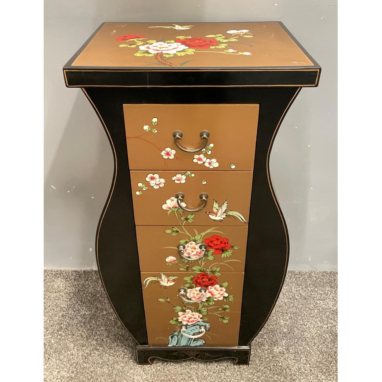 ORIENTAL decorative gold and black with oriental flowers pattern lacquered based 5 drawer UNUSUAL shaped cupboard