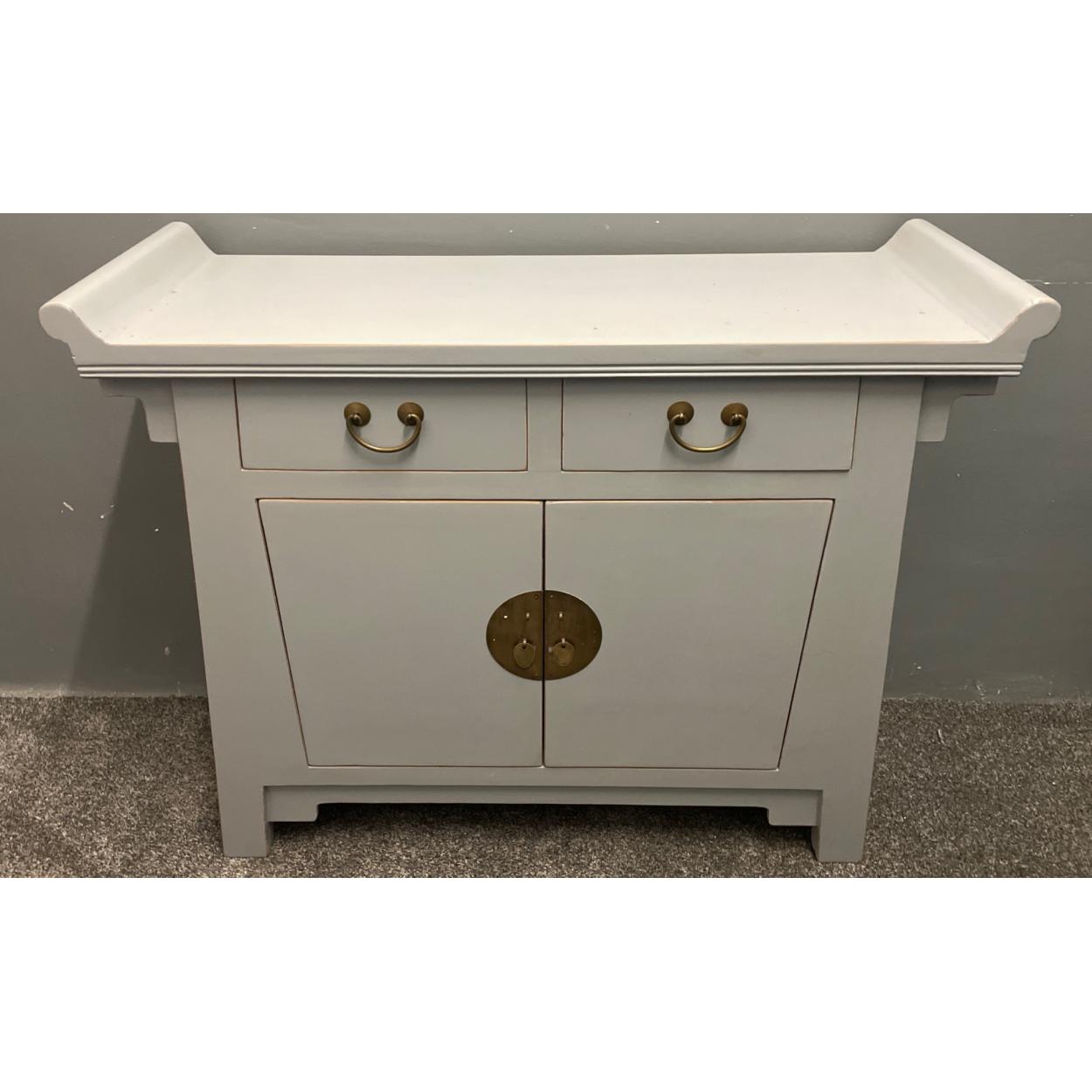 ORIENTAL decorative dove-white traditional design lacquered dove white/blue based two door and two drawer console cabinet - with traditional oriental upturned ends - new ! unused item in storage