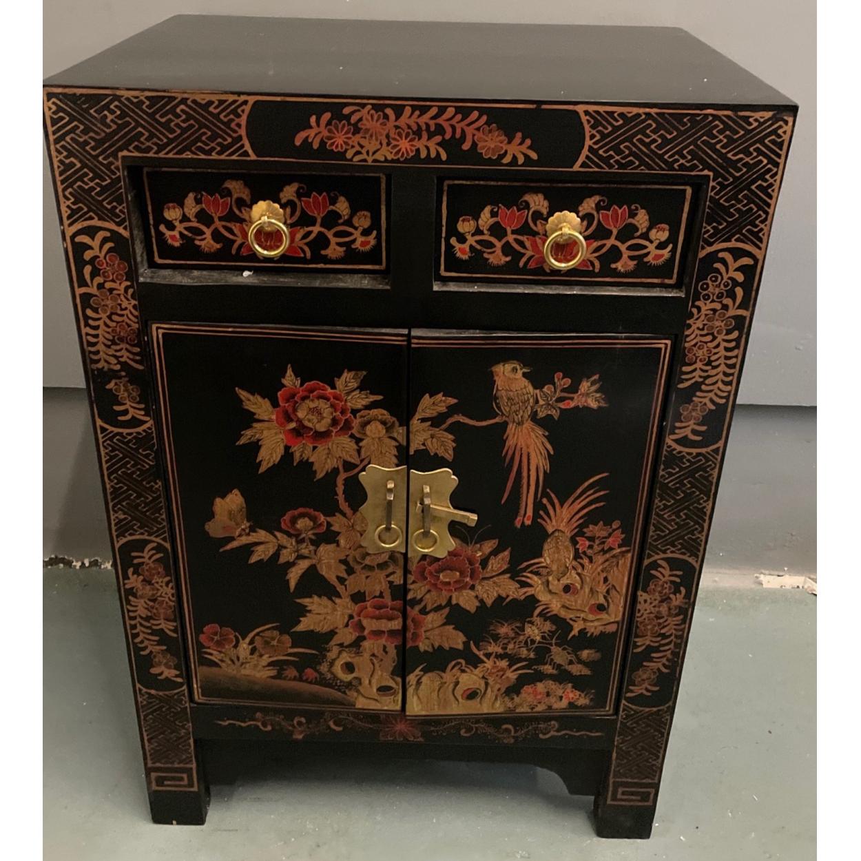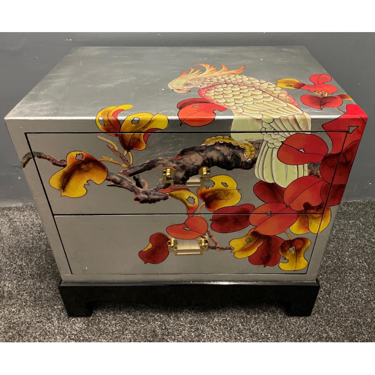 ORIENTAL decorative silver and floral lacquered based 2 drawer side cabinet - unused item in storage