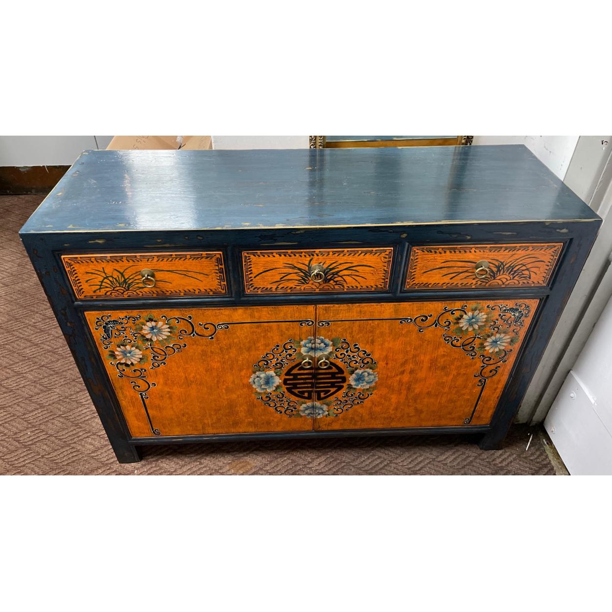 ORIENTAL decorative blue- distressed traditional design lacquered blue based two door and four drawer tall cabinet - new came still in still in wrappers! unused item in storage