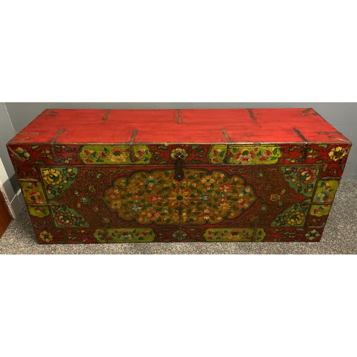 A STATEMENT PIECE - An ORIENTAL HIGHLY DECORATED 'hand-painted' lounge or bedroom storage blanket-box - with a nice brass style escutcheon style fittings - new and unused item in storage - great for storage !
